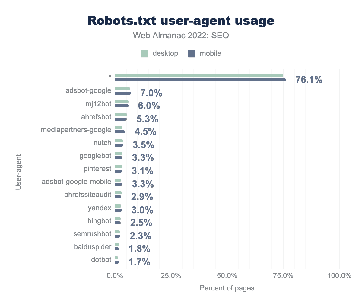 * が74.9%、adsbot-google が6.8%、mj12bot が6.0%、ahrefsbot が5.4%、mediapartners-google が3.4%、nutch が3.7%、googlebot が3.3%、pinterest が3.3%、adsbot-google-mobile が2.8%、ahrefssiteaudit が3.2%、yandexが2.9%、bingbotが2.6%、semrushbotが2.2%、baiduspiderが1.8%、最後にdotbotが1.5%。モバイルは76.1%、7.0%、6.0%、5.3%、4.5%、3.5%、3.3%、3.1%、3.3%、2.9%、3.0%、2.5%、2.3%、1.8%、1.7%とほぼ同じ。現在もっとも多くのウェブサイト(デスクトップ74.9%、モバイル76.1%)が、robots.txtファイル内で特定のユーザーエージェントを指定しておらず、これはファイル内のディレクティブがすべてのユーザーエージェントに適用されることを意味します。これは、デスクトップのrobots.txtファイルの74%、モバイルのrobots.txtファイルの75.2% が特定のユーザーエージェントを指定していなかった2020年のデータと一致しています。