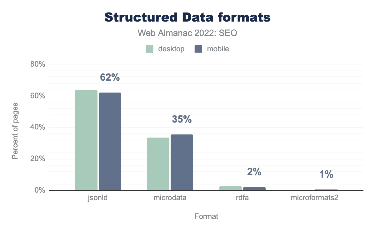 2021年の数字と比較すると、2022年のデータでは、JSON-LDによる実装は名目上増加し、マイクロデータによる構造化データの実装はわずかに減少しています。この数字は、とくにモバイルで顕著です。2021年には、モバイルページの60.5%が構造化データの実装にJSON-LDを使用していました。2022年に構造化データの追加にJSON-LDを使用したモバイルページの数は、2.3%増の61.9%です。逆に、2021年には、36.9%のモバイルページがマイクロデータによる構造化データを利用していました。2022年には4.3%減少し、35.3%になりました。