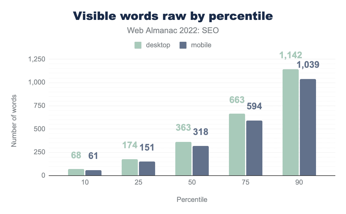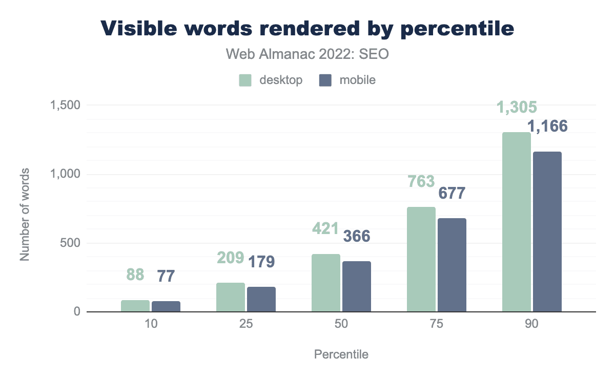 2022年のデスクトップ・ページの中央値は421語。これは2021年の425語に近い数字です。しかし、これは2020年のデスクトップページの中央値402ワードと比べると、パーセンテージ的には大きな飛躍です。2021年にレンダリング語数が増加した原因が何であれ、それは2022年まで続いているようです。