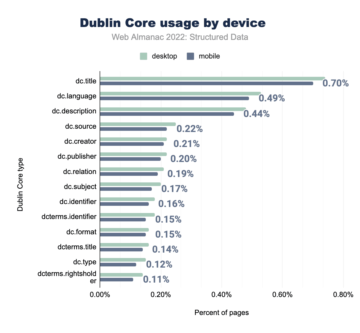 dc.titleがデスクトップページの0.74%、モバイルページの0.70%で使用されていることを示しています。dc.languageは0.53%と0.49% で、 dc.descriptionは0.48%と0.44%、dc.publisherは0.22%と0.22%、 dc.creatorは0.22%と0.21%、 dc.subjectは0.20%と0.20%、 dc.sourceは0.25%と0.19%、 dc.identifierは0.18%と0.17%、 dc.relationは0.21%と0.16%、dcterms.titleは0.16%と0.15%、dc.formatは0.16%と0.15%、dc.typeは0.15%と0.14%、dcterms.rightsholderは0.14%と0.12%、最後に dcterms.identifier はデスクトップのページの0.18%, モバイルページの0.11% で使用されました。その他、ダブリンコアのタイプはモバイルページとデスクトップページでほぼ同じで、前年と比較して出現率が若干増加しているのは共通しています。