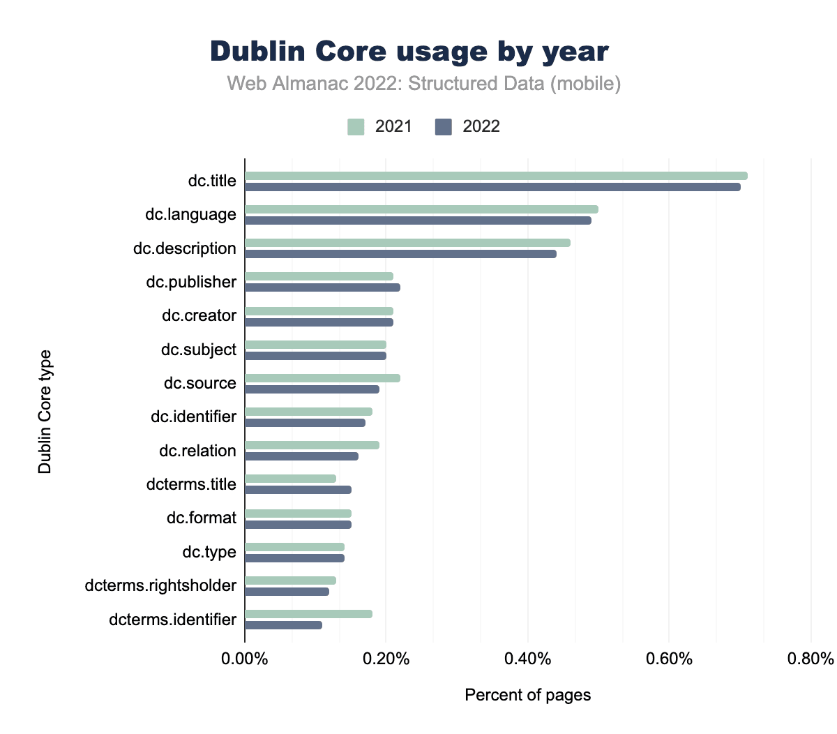 dc.titleが使用されたことを示す棒グラフ。dc.languageが0.50%と0.49%、dc.descriptionが0.46%、0.44%、dc.publisher は0.21%と0.22%、 dc.creatorは0.21%と0.21%、 dc.subjectは0.20%と0.20%、 dc.sourceは0.22%と0.19%、dc.identifierが0.18%と0.17%、dc.relationが0.19%と0.16%、dcterms.titleが0.13%と0.15%、dc.formatが0.15%と0.15%、doc. typeが0.14%と0.14%、 dcterms.rightsholderが0.13%と0.12%、そして最後に dcterms.identifier が2021年にはモバイルページの0.18%で、2022年には0.11%で使用されることになりました。ダブリンコアの属性タイプの使用率は、もっとも顕著な属性タイプで非常によく似たままです。注目すべき例外はdcterms.identifier で、2021年の0.11%から2022年にはモバイルページで0.18%に増加しています。割合としては小さいですが、これは私たちのセットで合計すると約15,000の使用回数になります。この増加は、デスクトップ・ページでも見られましたが、それほど大きくはなく、2021年の0.14%から2022年の0.18%になりました。