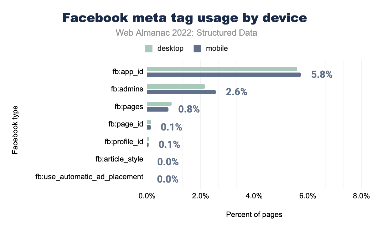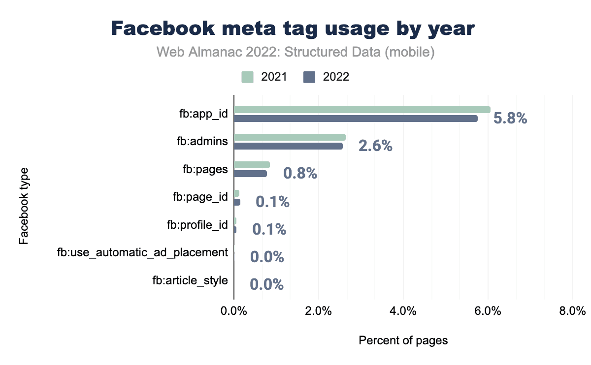 fb:app_idが使用された事を示す棒グラフ。fb:adminsはそれぞれ2.6%、2.6%、fb:pagesでは0.9%、0.8%、fb:page_idとfb:profile_id は両年で0.1%、 fb:use_automatic_ad_placementとfb:article_style は両年で0.0% となりました。ここにあるすべてのFacebookタグのうち、出現数が多いのは3つだけです。これらは2021年の上位3つと同じで、fb:app_idが5.8%、fb:adminsは2.6%、モバイルではfb:pagesが0.8%と、いずれも昨年より微減しています。