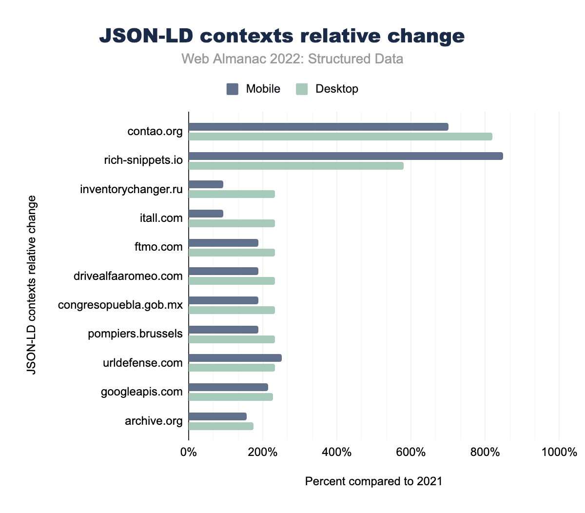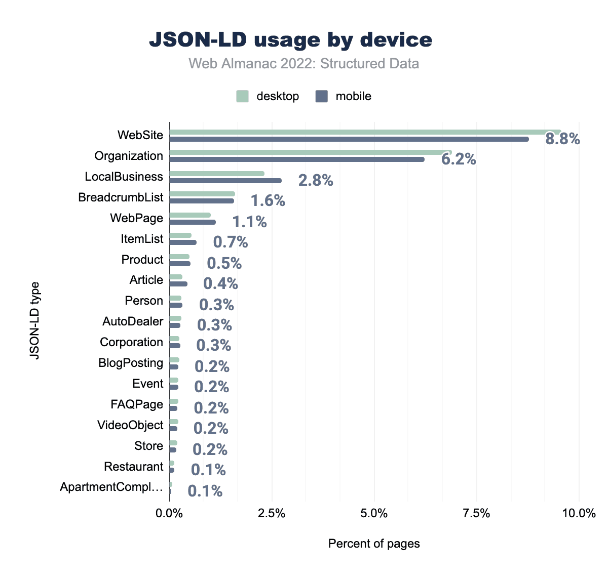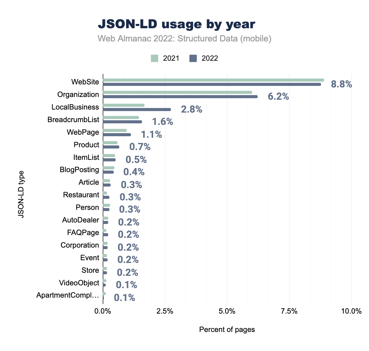 WebSiteが使用されていることを示しています。Organizationが6.9%、6.2%、LocalBusinessでは2.3%、2.8%、BreadcrumbListは1.6%と1.6%、WebPageが1.0%と1.1%、Productが0.5%と0.7%、ItemListが0.6%と0.5%、BlogPostingが0.2%と0.4%、Articleが0.3%と0.3%、Restaurantが0.1%と0.3%、Personが0.3%と0.3%、AutoDealerは0.3%と0.2%、 FAQPageは0.2%と0.2%、 Corporationは0.2%と0.2%、 Eventは0.2%と0.2%、 Storeは0.2%と0.2%、また、VideoObjectは0.2%と0.1%で、最後にApartmentComplexはデスクトップとモバイルの両方のページの0.1%で使用されています。これらの増加により、JSON-LDタイプは2021年以降で2番目に大きなポジティブな変化を遂げ、セット内のモバイルページでは33.5%から36.5%に、デスクトップページでは34.1%から36.9%に表示されています。