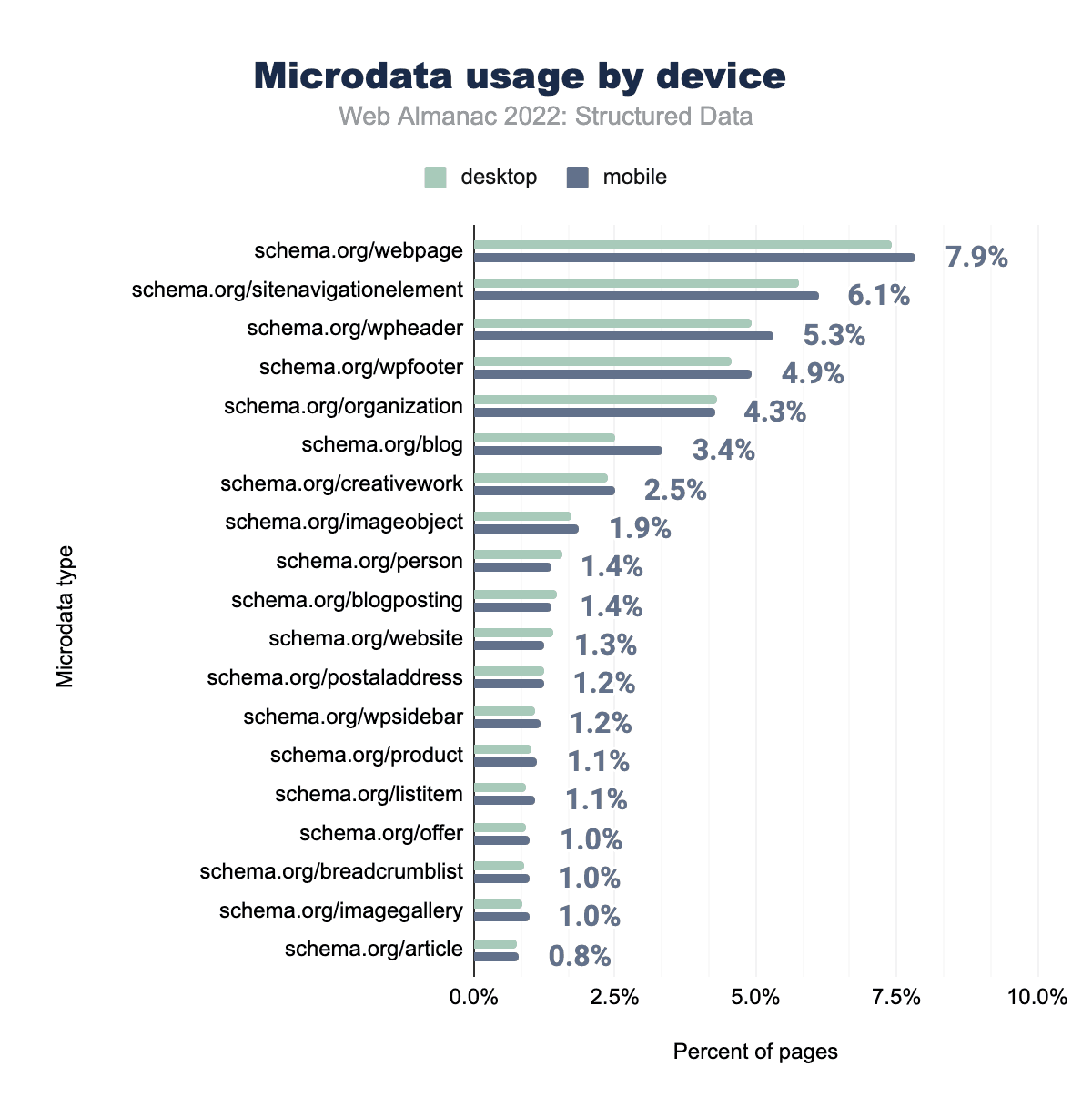 schema.org/webpageがデスクトップの7.4%、モバイルの7.9%のページで使用されていることを示しています。schema.org/sitenavigationelementが5.8%と6.1%、schema.org/wpheaderが4.9%と5.3%、schema.org/wpfooterが4.6%と4.9%、schema.org/organizationが4.3%と4.3%、schema.org/blogが2.5%と3.4%、schema.org/creativeworkが2.4%と2.5%、schema.org/imageobjectが1.7%と1.9%、schema.org/personが1.6%と1.4%、schema.org/websiteが1.4%と1.4%、schema.org/postaladdressが1.3%と1.3%、schema.org/blogpostingは1.5%と1.2%、schema.org/wpsidebarは1.1%と1.2%、schema.org/imagegalleryは0.9%と1.1%、schema.org/productは1.0%と1.1%、schema.org/offerは0.9%と1.0%、schema.org/listitemは0.9%と1.0%、schema.org/breadcrumblistは0.9%と1.0%、最後に schema.org/article はデスクトップとモバイルページの両方で0.8% 使用されています。これらの増加はデスクトップでも同様で、wpsidebar(モバイルページでは1.4%から1.2%、デスクトップページでは1.3%から1.1%)など他の場所ではわずかに減少し、モバイル、デスクトップページともに全体として過去1年間の変化は最小となっています。