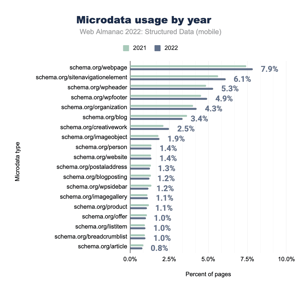 schema.org/webpageが使用されていることを示す棒グラフです。schema.org/sitenavigationelementが5.6%と6.1%、schema.org/wpheaderが4.9%と5.3%、schema.org/wpfooterが4.6%と4.9%、schema.org/organizationが4.0%と4.3%、schema.org/blogが3.7%と3.4%、schema.org/creativeworkが2.1%と2.5%、schema.org/imageobjectが1.8%と1.9%、schema.org/personが1.4%と1.4%、schema.org/websiteが1.3%と1.4%、schema.org/postaladdressが1.3%と1.3% でありました。schema.org/blogpostingが1.3%と1.2%、schema.org/wpsidebarが1.4%と1.2%、schema.org/imagegalleryが1.1%と1.1%、schema.org/productが1.2%と1.1%、 schema.org/offerが1. 1%と1.0%、 schema.org/listitem が1.0%、1.0%、schema.org/breadcrumblistが1.0%、1.0%、そして最後に schema.org/articleが2021年にモバイルページの0.9%、2022年にモバイルページの0.8%で使用されています。マイクロデータのプロパティのほとんどはあまり変化していませんが、webpage、sitenavigationelement、wpheaderといったより一般的なプロパティは、それぞれモバイルページの7.9%、6.1%、5.3%に表示されており、若干の増加が見られます。