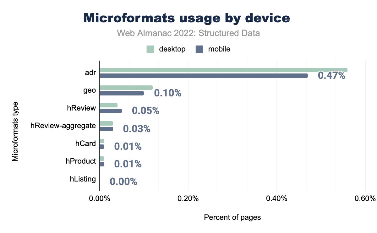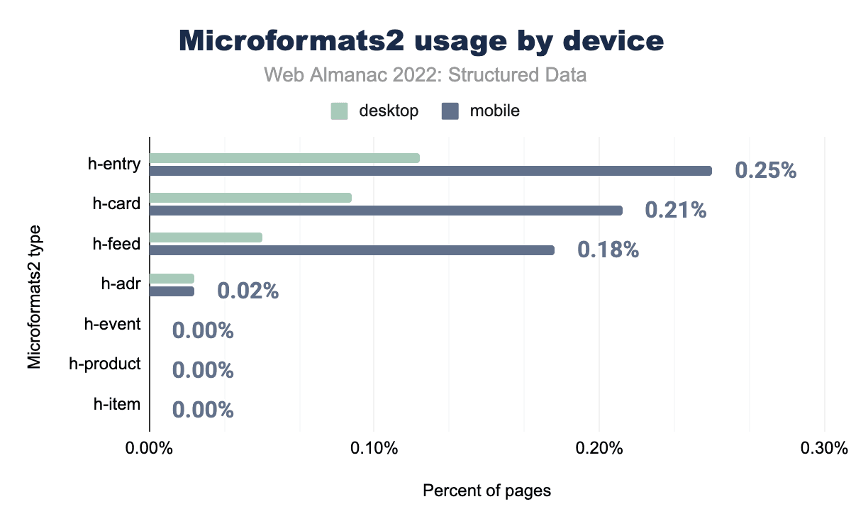 h-entryがデスクトップページの0.12%、モバイルページの0.25%、h-cardがそれぞれ0.09%、0.21%、h-feedでは0.05%、0.18%、h-adrは0.02%、そして h-event, h-productとh-item がデスクトップとモバイルページの0.00%で使用されていたことを示すものです。この増加は、モバイルページでより顕著に見られますが、デスクトップページも同じパターンを辿っています。それ以外では、h-adrは両年、両プラットフォームとも0.02%でまったく変わりません。