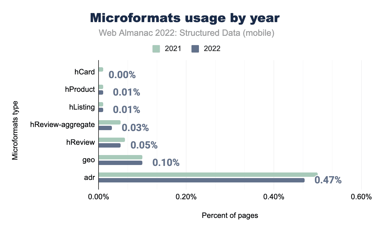 adrが使用された事を示す棒グラフ。geo がそれぞれ0.10%、0.10%、hReviewが0.06%、0.05%、hReview-aggregateは0.05%と0.03%、hListingとhProduct が両年とも0.01%、最後に hCard が2021年にはモバイルページの0.01%、2022年には0.00% で使用されます。マイクロフォーマットは、2021年以降、使用法の数はもっとも一般的なもので、adr(私たちのセットの0.47%のページに出現)は、依然としてリストの中でもっとも一般的なものです。