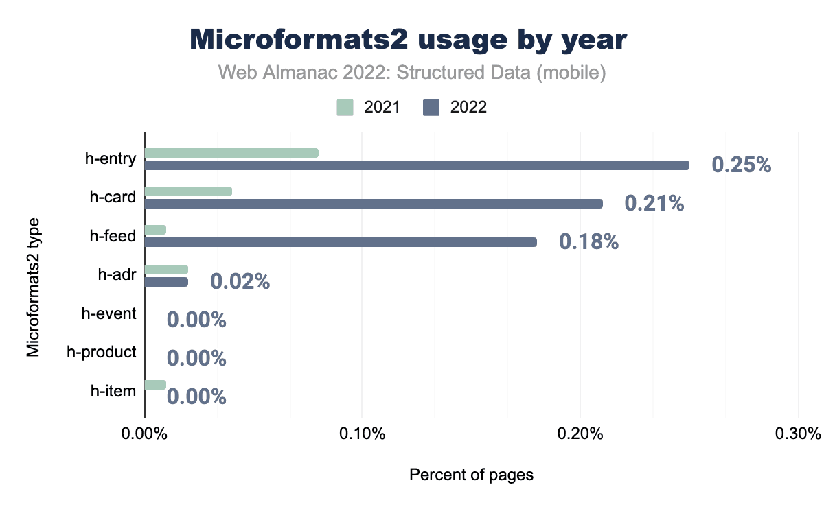 h-entryが使われ、0.04%と0.21%でh-cardが使われていることを示しています。h-feedは0.01%と0.18% で、h-adrは0.02%と0.02% で、h-eventは0.00%と0.00% で、h-productは0.00%と0.00%、最後に h-itemは2021年に0.01%、2022年は0.00% でモバイルページに対して使用されています。一方、2021年以降、マイクロフォーマット2の属性は急増しています。h-entry、h-card、h-feedのプロパティは、我々のページのセットで大きな増加を示しており、これはマイクロフォーマット2の属性が前年からほぼ3倍になったことを説明するものです。