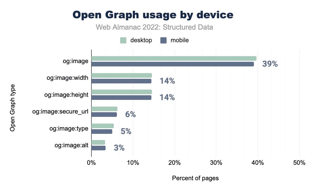 og:image が使用され、 og:image:width が13%、14%、 og:image:height が13%、14%、 og:image:secure_url が6%、6%、 og:image:type が2%、5%、最後に og:image:altが2021年に2%、2022年は3%のモバイルページで使用されたことを表しています。Open Graphタグは、広く使用されるようになりました。これらのタグのうちもっとも一般的なのは、og:titleであり、og:url、og:typeとともに、セット内の全ページの半数以上に出現しています。もっとも多くの増加幅は小さく、例外的に og:image:type は2021年以降、モバイルページで3倍以上になっています。これはデスクトップでも同様で、1年の間に1.6%から5.4%になりました。