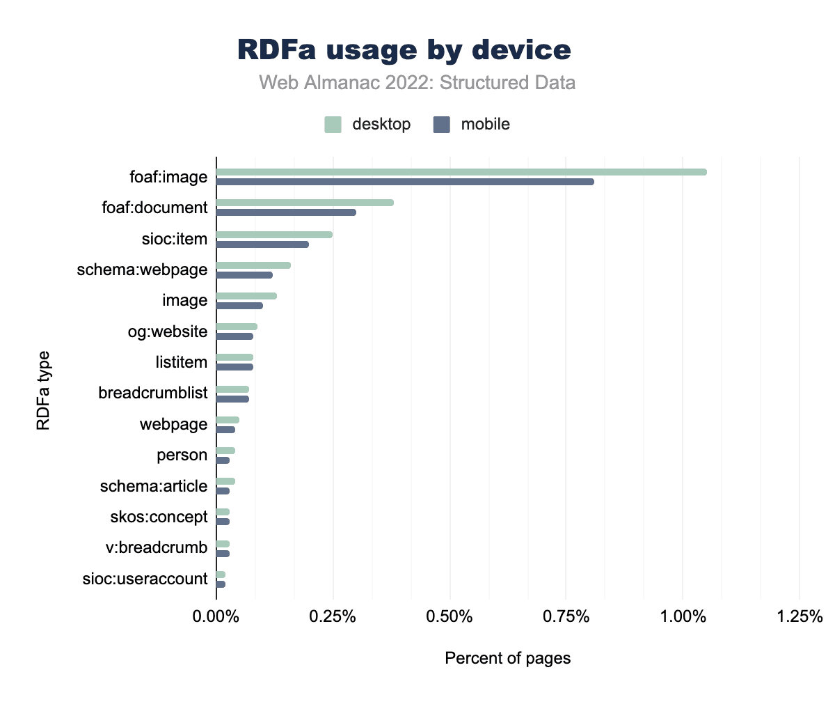 foaf:image がデスクトップの1.05% とモバイルの0.81% で、foaf:documentが0.38%と0.30%で、sioc:itemが0.25%と0.20%で、schema:webpage が0.16%と0.12%、imageが0.13%と0.10%、og:websiteが0.07%と0.08%、listitemが0.09%と0.08%、breadcrumblistが0.08%と0.07%、 webpage が0.05%、0.04%、 personが0.03%、0.03%、 schema:article が0.04%と0.03%、skos:concept が0.04%、0.03%、 v:breadcrumb が0.03%、0.03%、そして最後に sioc:useraccount がデスクトップとモバイル両方のページの0.02% で使用されています。RDFaはデスクトップでより顕著で、foaf:imageはモバイルページの0.81%に対し、デスクトップページの1%に出現しています。その他のRDFaタイプは、モバイルよりもデスクトップページでの出現率がわずかに上昇しましたが、og:websiteは例外で、モバイルページでは0.08%、デスクトップページは0.07%で先に到達しています。