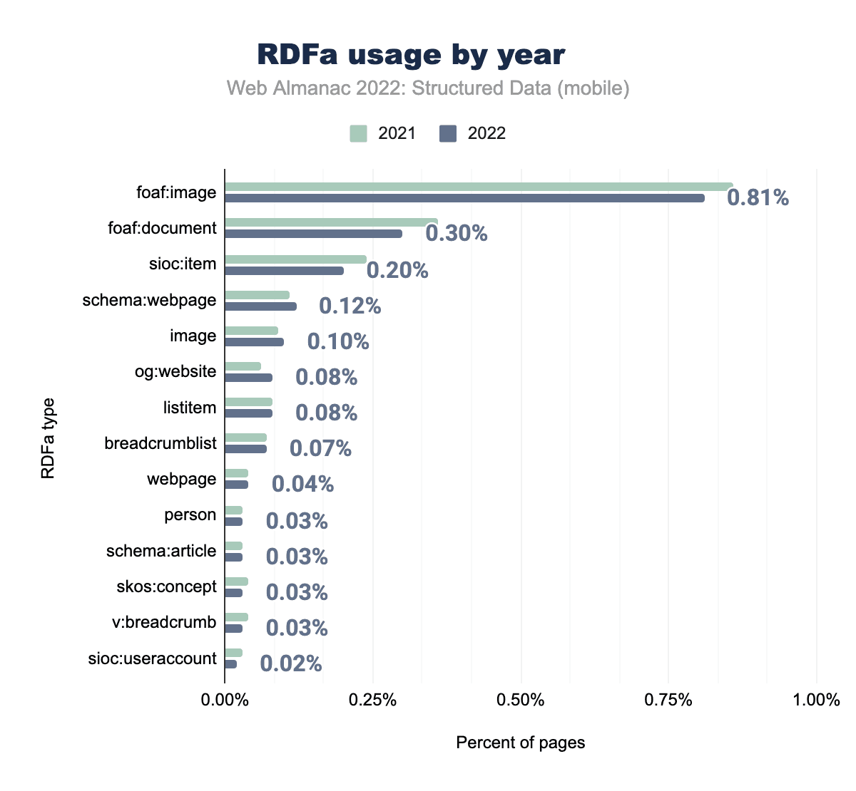 foaf:image が使われ、 foaf:document が0.36%、0.30%、 sioc:item が0.24%、0.20%、 schema:webpage が0.11%、0.12%、 image が0.09%、0.10%、og:website が0.06%、0.08%、listitem が0.08%、0.08%、breadcrumblistが0.07% 、0.07%、webpageが0.04%、0.04%、personは0.03%、0.03%、schema:articleで0.03%、0.03%, skos:conceptは0.04%、0.03%、v:breadcrumb が0.04%と0.03%、そして最後にsioc:useraccountが2021年に0.03%、2022年で0.02%のページで使用されています。RDFaのタイプを評価すると、foaf:imageは他のどのタイプよりも多くのページに存在していますが、2021年以降、セットに含まれるページの割合が減少していることがわかります。これは次の2つのタイプ、foaf:documentとsioc:itemにも当てはまり、使用率がわずかに減少しています。他の多くのタイプは、RDFaが全体として見ているように、使用率がわずかに増加していることがわかります。