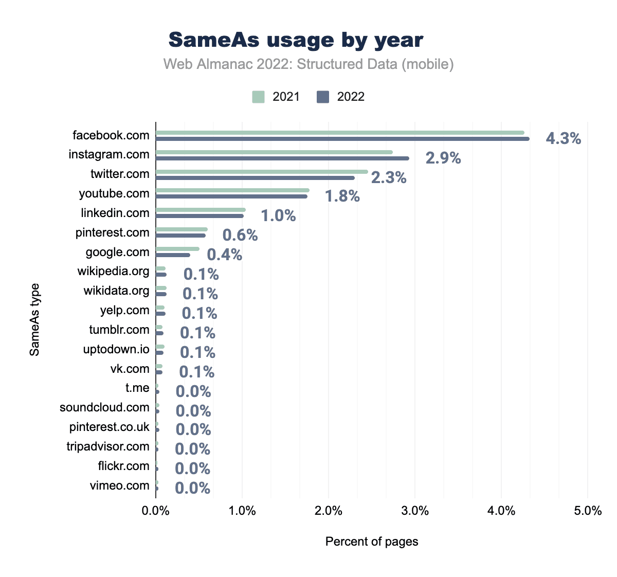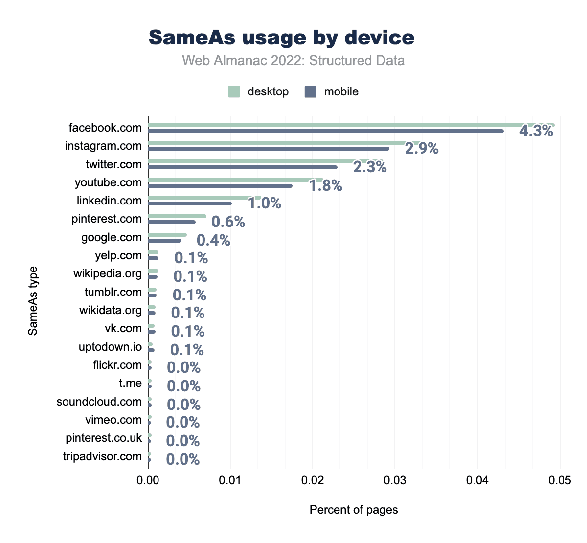 facebook.comがデスクトップの4.9%、モバイルの4.3%、instagram.comが3.3%、2.3%、twitter.comは2.9%、1.8%、youtube.comが1.4%と1%、pinterest.comが0.7%と0.6%、goo.comが0.5%と0.4%、wikipedia.orgは0.1%、0.1%、 wikidata.org が0.1%、0.1%、 yelp.comが0.1%、0.1%、 tumblr.comでは0.1%と0.1%、 uptodown.io が0.1%、 0.1%、 vk.comが0.1%と0.1% 、そして t.me、soundcloud.com、pinterest.co.uk、tripadvisor.com、flickr.com、そして vimeo.com がデスクトップとモバイル両方のページの0.0%で使用されていることがわかりました。SameAs の使用状況