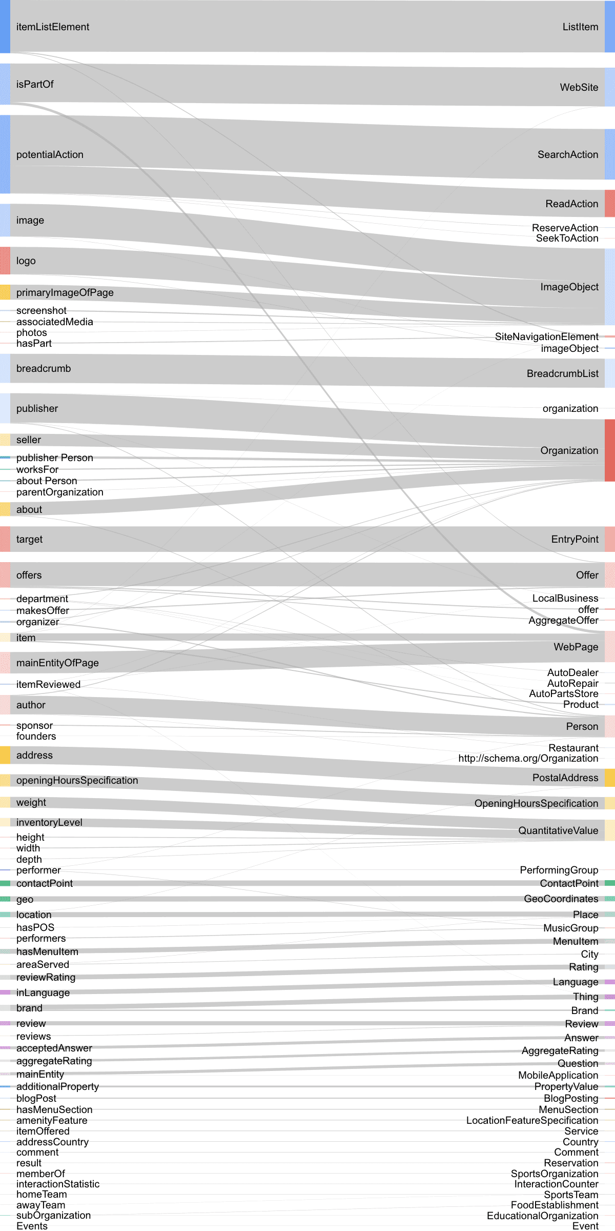 itemListElementからListItem、isPartOfからWebsite、potentialActionからSearchActionとReadAction、image、logo、primaryImageOfPage から ImageObjectで、続いてあまり使われていない長いリレーションのリストあります。この分析の主な限界は、関係性の連鎖をホームページレベルで評価できることに表されている。