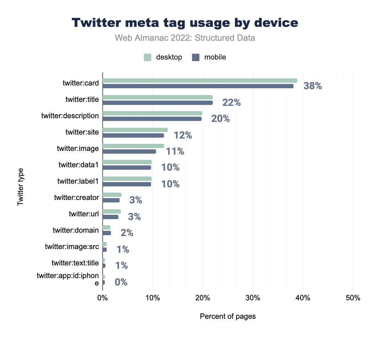 twitter:cardがデスクトップページの39%、モバイルページの38%で使用されていることを示しています。twitter:titleが22%と22% で、twitter:descriptionが20%と20% で、twitter:imageが12%と12% であった。twitter:siteは13%と11%、twitter:label1は10%と10%、twitter:data1は10%と10%、twitter:creatorは4%と3%、twitter:urlは4%と3%、twitter:domainは2%と2%、twitter:image:srcは1%、1%、 twitter:text:titleでは0%と1%、最後に twitter:app:id:iphone は0%の割合でした(デスクトップ、モバイルページとも)。twitter:siteやtwitter:imageなどのTwitterメタタグは、デスクトップサイトでより大きな存在感を示していますが、これらのメタタグの大半はモバイルとデスクトップの間、また前年比で同じ普及率を示しています。あまり一般的でないタグの中には、今年、使用率がわずかに減少したものもありますが、Twitterのメタタグの使用率は昨年から全体的に増加を維持しています。