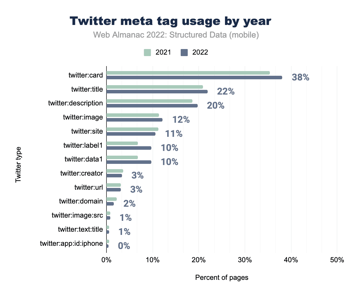 twitter:cardが使用されたことを示す棒グラフ。twitter:titleが21%、22%、twitter:descriptionが19%と20%、 twitter:imageが11%と12%、 twitter:siteが11%と11%、 twitter:label1が7%と10% 、twitter:data1は7%と10%、twitter:creatorは4%と3%、twitter:urlは3%と3%、twitter:domainは2%と2%、twitter:image:srcは1%と1%、twitter:text:titleは1%と1%、最後に twitter:app:id:iphone が2021年にはモバイルページの1%、2022年には0%のページで使用されていたことが分かりました。Twitterのメタタグは再び、一般的な使用率の増加パターンにしたがっており、とくにtwitter:card、twitter:title、twitter:description、twitter:imageの共通タグで増加しています。注目すべきは、twitter:label1とtwitter:data1で、ともに2021年の7%から2022年にはモバイルページで10%に増加していることが確認できます。