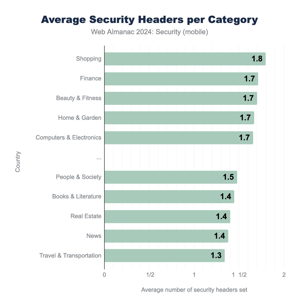 ウェブサイトの分類によっては、使用される平均的なセキュリティヘッダーの数に微妙な違いがあることがわかります。この数は、これらのサイトの全体的なセキュリティを直接示すものではありませんが、どの業界のカテゴリがより多くのセキュリティ機能を実装する傾向があるかについての洞察を与える可能性があります。ショッピングと金融がリストのトップにあり、どちらも機密情報や高額な金銭取引を扱う業界であり、セキュリティへの投資の理由となる可能性があります。リストの下部にはニュースと旅行・交通があります。どちらも、それぞれのトピックに関連するコンテンツをホストするサイトが多いカテゴリですが、リストの上位カテゴリのサイトと比較して、多くの機密データを扱わない場合があります。一般的に、この傾向は弱いようです。