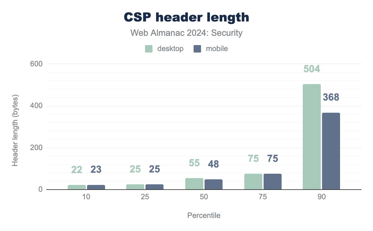 CSPヘッダーの採用率は、2022年の全ホストの15%から今年は19%に増加しました。これは27%の相対的な増加に相当します。この2年間で、相対的な増加は2022年から2023年にかけて12%、2023年から2024年にかけて14%でした。