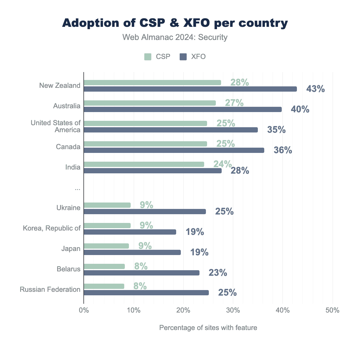 しかし、これらの保護を弱める可能性のある不適切な設定や設定ミスにも注意を払う必要があります。無効なディレクティブや不十分に定義されたポリシーのような問題は、ブラウザが効果的にセキュリティを強制するのを妨げる可能性があります。たとえば、全Timing-Allow-Originヘッダーの82.5%が、任意のオリジンに詳細なタイミング情報へのアクセスを許可しており、これはタイミング攻撃で悪用される可能性があります。同様に、security.txtを介したセキュリティ問題の報告を有効にしているウェブサイトはわずか1%であり、多くは依然としてPHPのバージョンを公開しており、これは潜在的な脆弱性を明らかにする可能性のある不必要なリスクです。明るい面としては、これらの問題のほとんどは簡単に解決できるものであり、通常、ウェブサイトの実装に最小限の変更を加えるだけで対処できます。