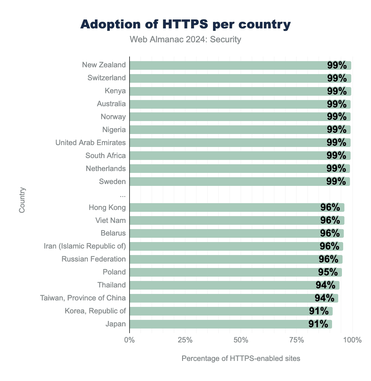 2022年の前回Almanac以降、TLSを使用して提供されるリクエストの数はさらに4%上昇し、モバイルでは98%になりました。
