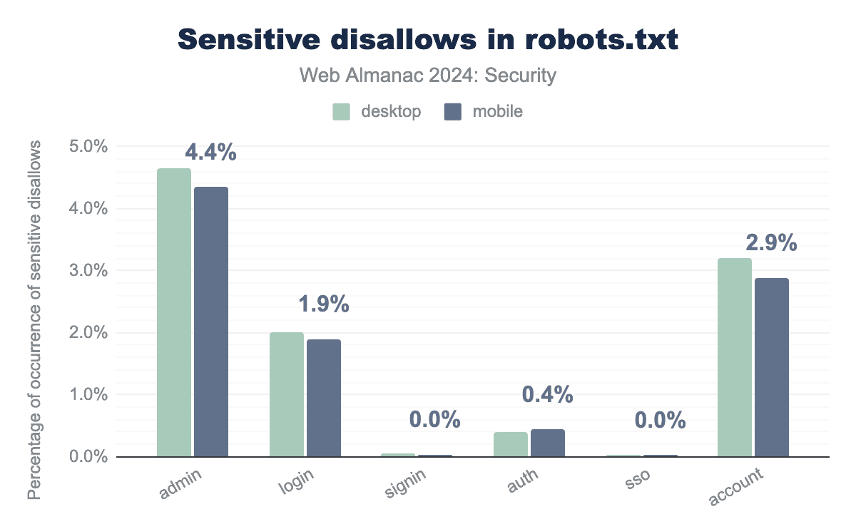 adminが拒否ルールで見つかり、デスクトップで2.0%、モバイルで1.9%のlogin、デスクトップとモバイルの両方で0.0%のsignin、デスクトップとモバイルの両方で0.4%のauth、デスクトップで3.2%、モバイルで2.9%のaccountが見つかったことを示す縦棒グラフ。約4.3%のウェブサイトがrobots.txtファイルに少なくとも1つのadminエントリを含んでいることがわかります。