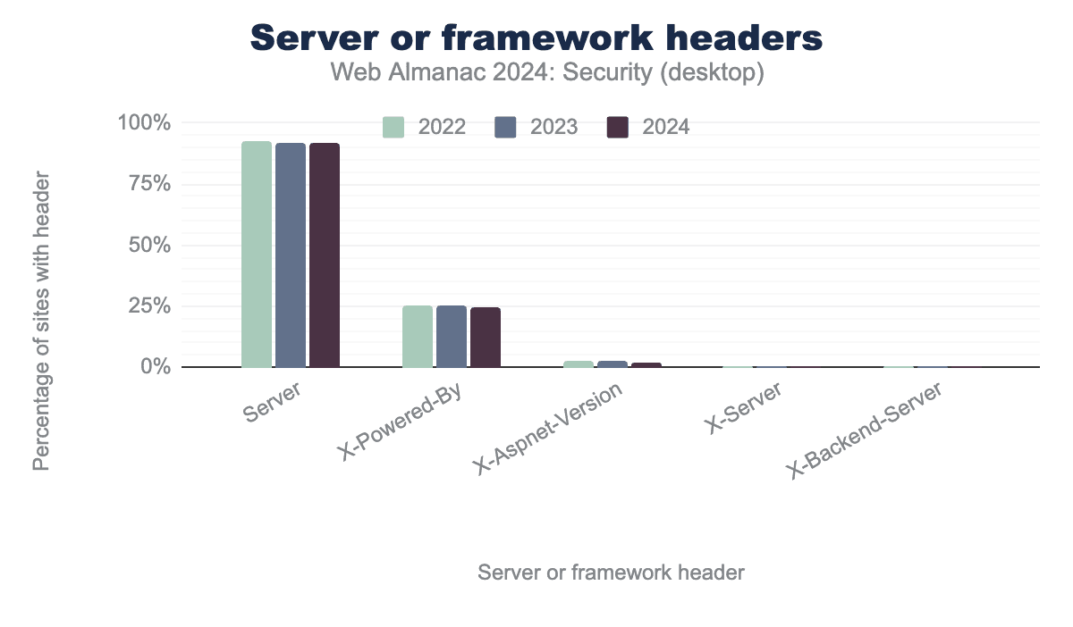 Serverヘッダーについては、2022年、2023年、2024年にそれぞれ92%、92%、92%です。X-Powered-Byについては、それぞれ25%、25%、24%です。X-Aspnet-Versionヘッダーについては、それぞれ3%、2%、2%です。X-Serverヘッダーについては、それぞれ0%、0%、0%です。X-Backend-Serverヘッダーについては、それぞれ0%、0%、0%です。もっとも一般的に公開されているヘッダーはServerヘッダーで、サーバーで実行されているソフトウェアを明らかにします。これに続くのがX-Powered-Byヘッダーで、サーバーが使用するテクノロジーを公開します。
