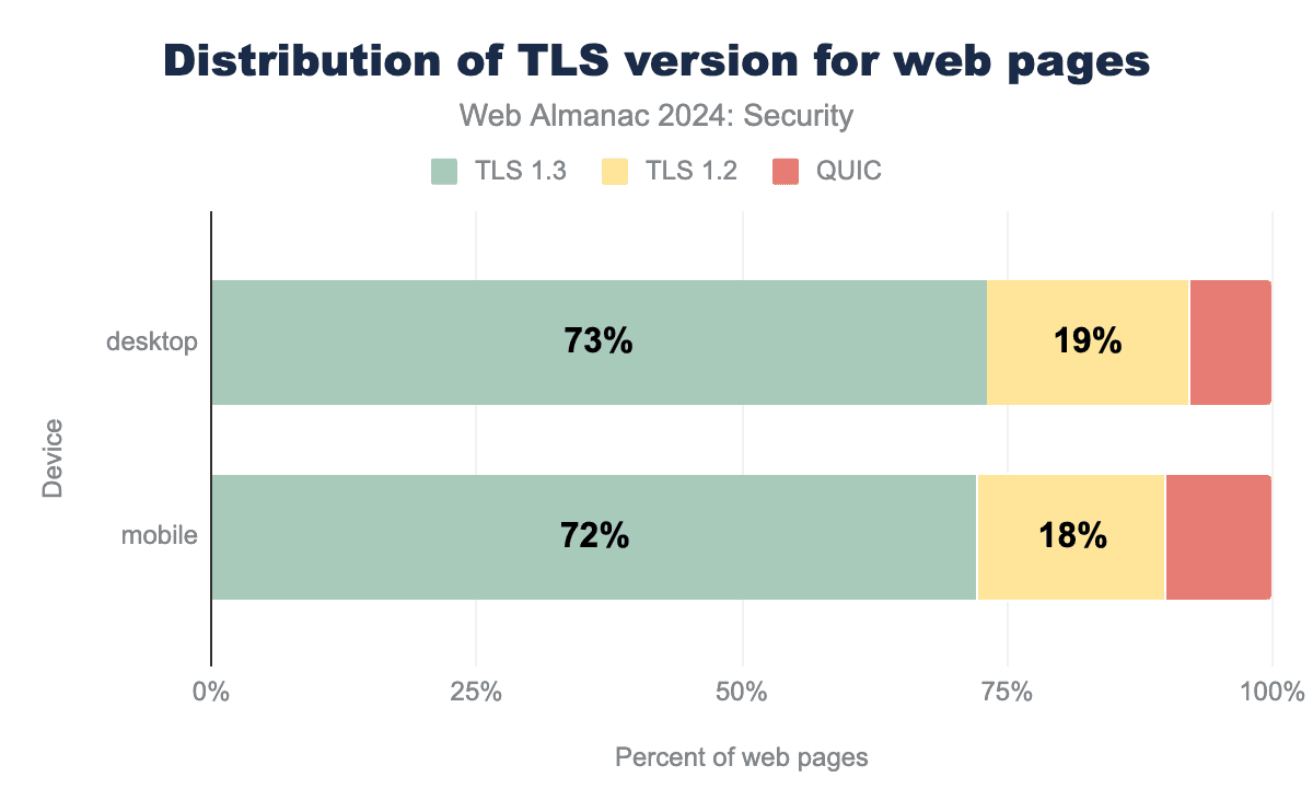 TLSv1.3 を使用し、19%が TLSv1.2 を、8%が QUIC を使用していることを示しています。モバイルでは、それぞれ72%、18%、10%です。TLS1.3はウェブページの73%でサポートされ、使用されていることがわかります。QUICが2022年と比較して大幅に利用されるようになり、モバイルページの0%からほぼ10%に移行したにもかかわらず、TLS1.3全体の利用は増加しています。TLS1.2の利用は予想通り減少し続けています。前回のAlmanacと比較すると、モバイルページでは12%以上減少し、TLS1.3は2%強増加しました。TLS1.2の利用が減少し続けるにつれて、QUICの採用は増加し続けると予想されます。