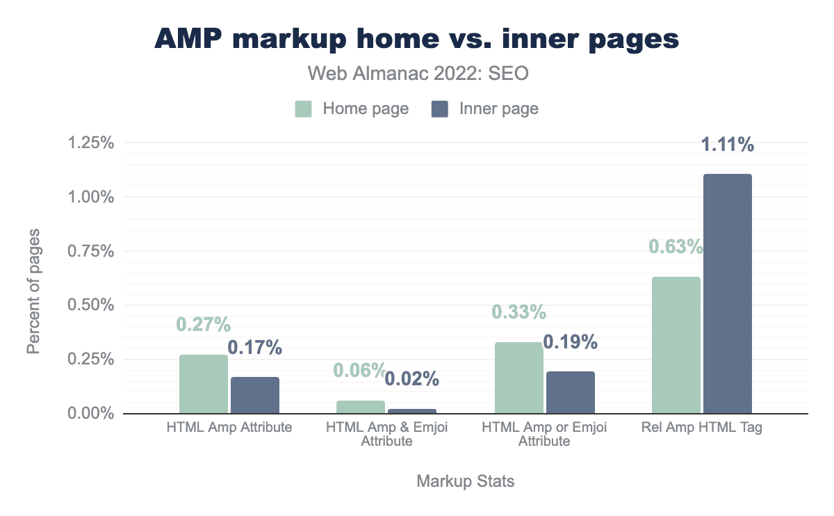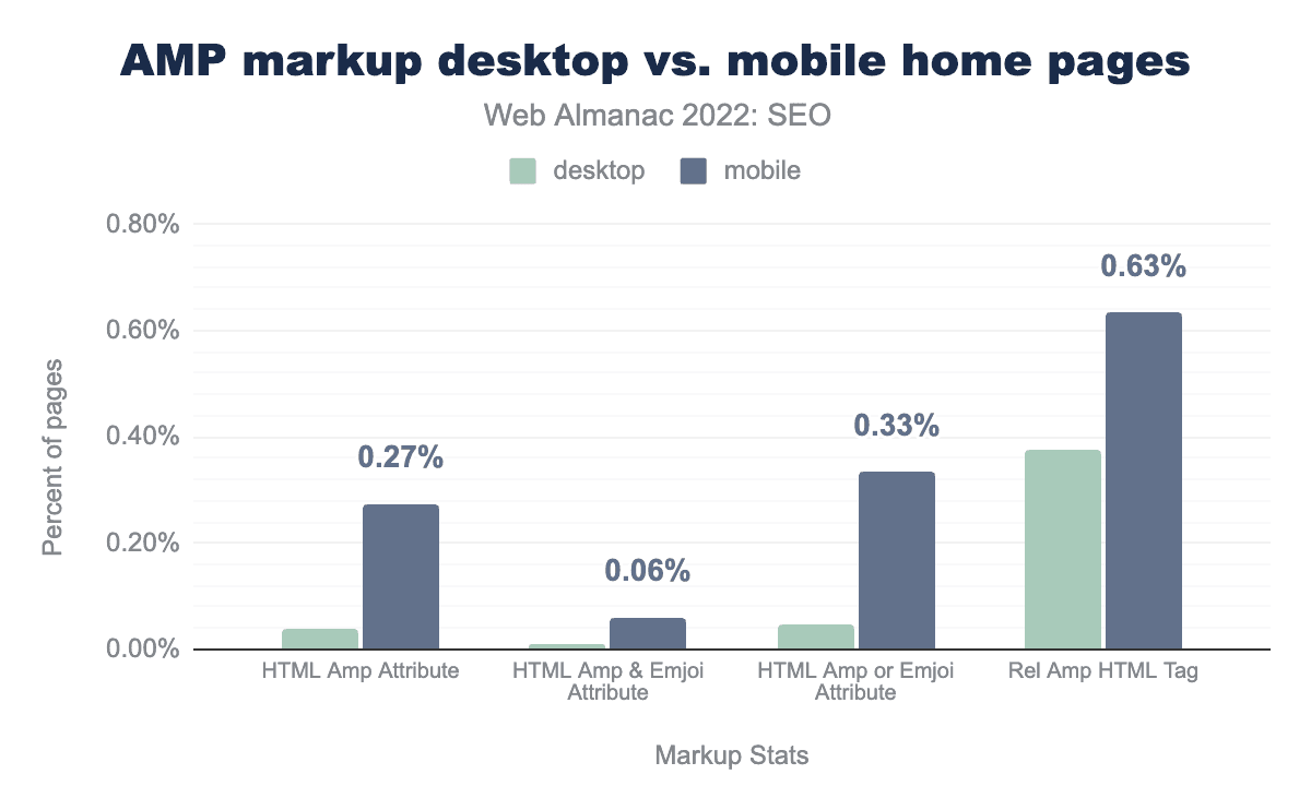 ホームページは内部ページよりもクロールされたときにAMPページである可能性が高く、モバイルとデスクトップ全体でホームページの0.31%、内部ページではわずか0.21%がHTML AMP属性を持っています。