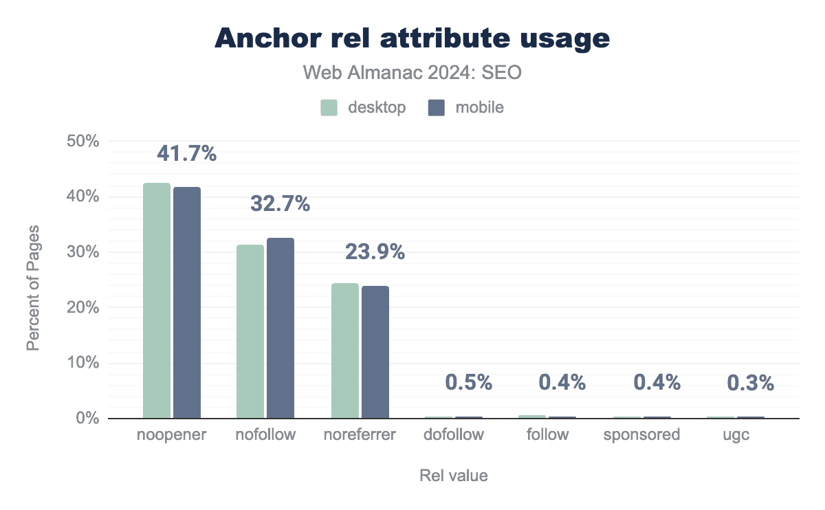 より具体的な属性が2019年に導入されました。これには、スポンサードコンテンツへのリンクを示す sponsored と、(パブリッシャーではなく)ユーザーによって追加されたユーザー生成コンテンツへのリンクを示す ugc があります。これらの属性の採用は低いままです。2024年では、sponsored がわずか0.4%、ugc が0.3%でした。両方とも、実際には実在しない属性で検索エンジンに無視される dofollow と follow よりも人気が低いか同等でした。
