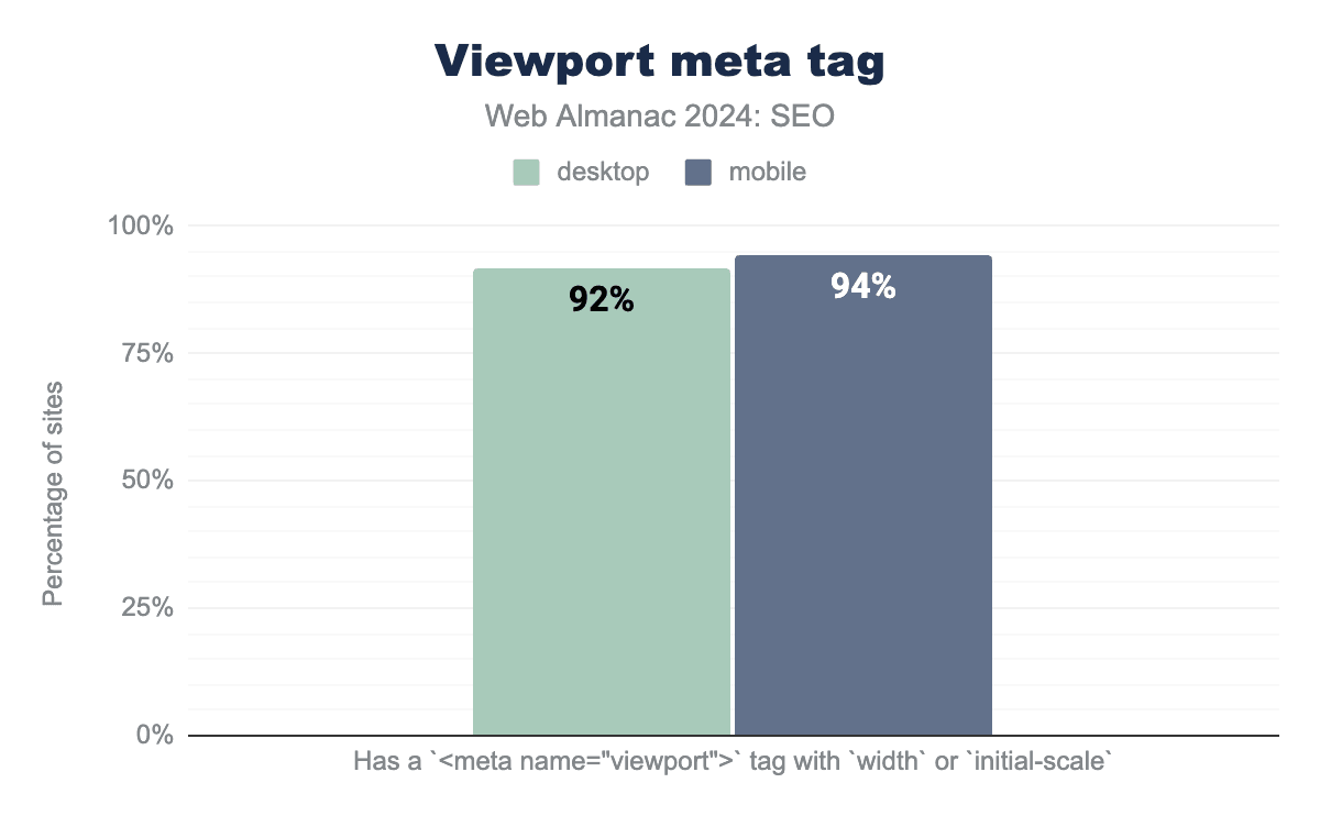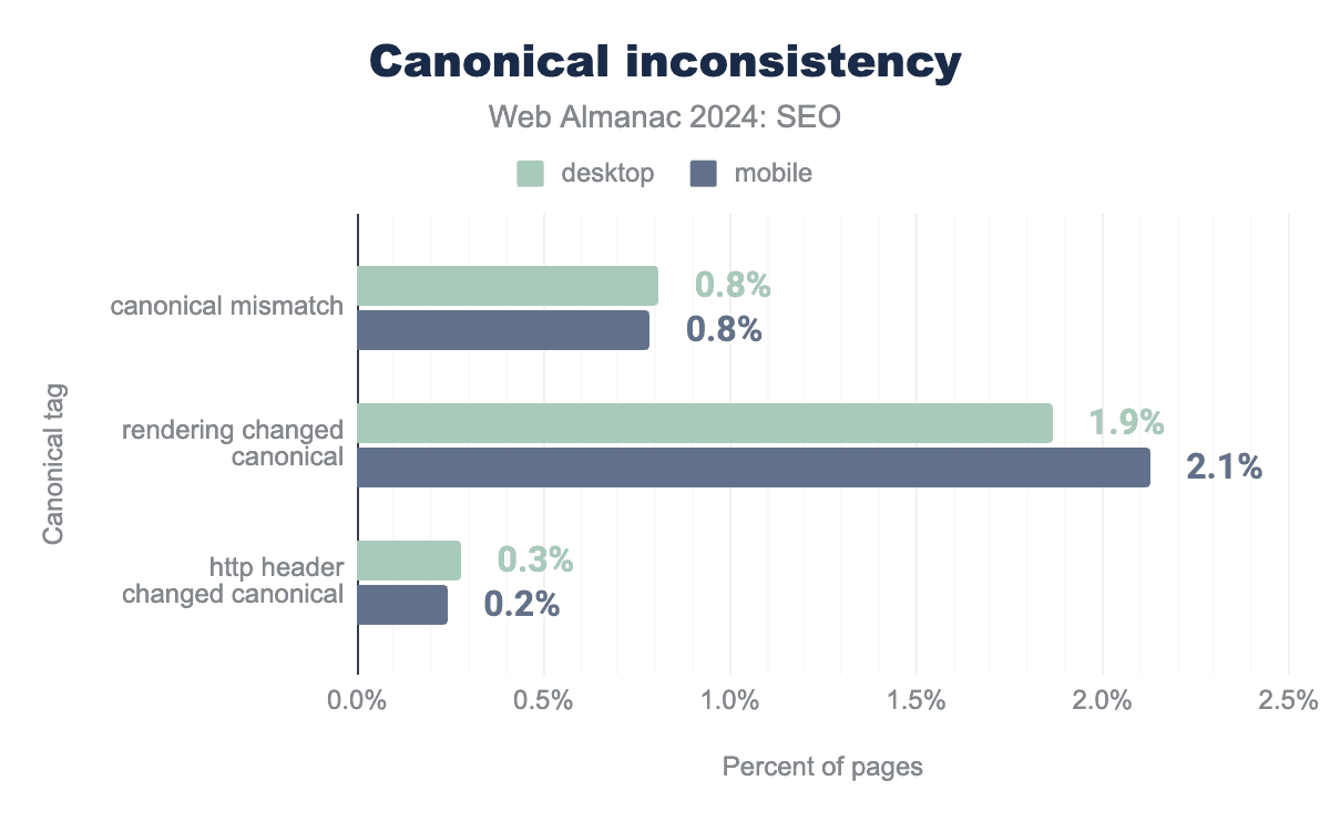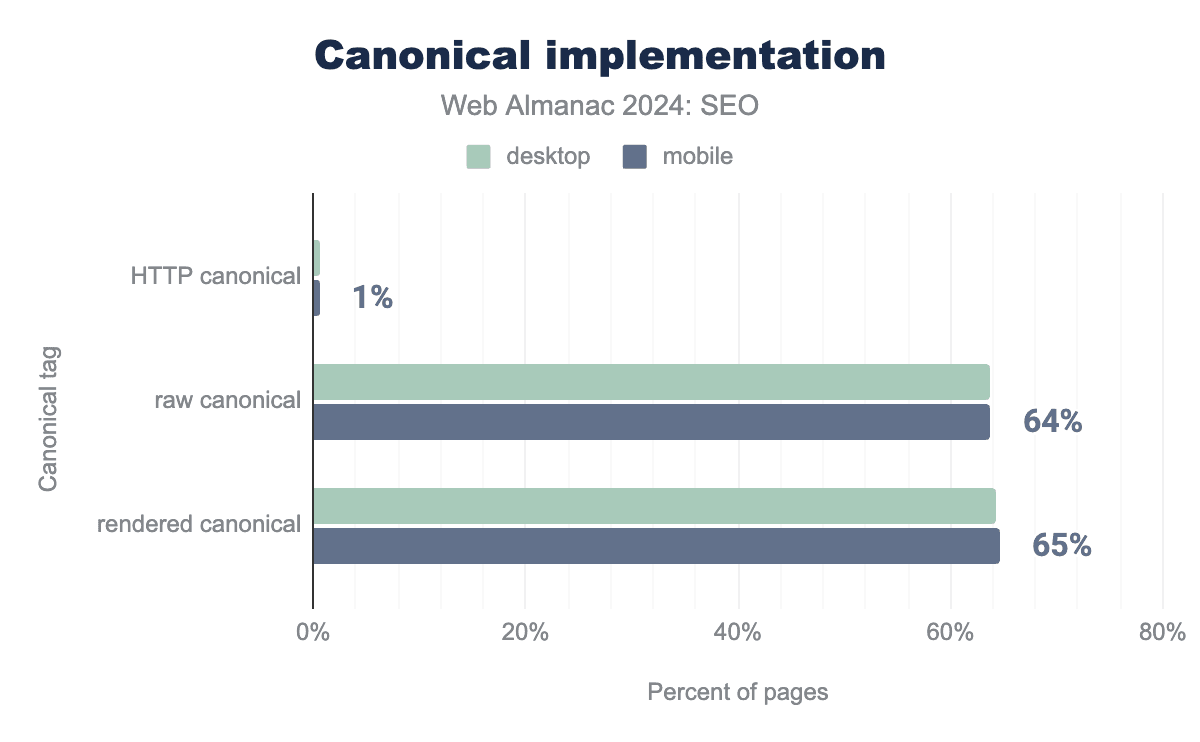 canonical タグの使用は2024年にわずかに増加しました。2022年では、モバイルページの61%とデスクトップページの59%が canonical タグを使用していました。2024年では、モバイルページの65%とデスクトップページの69%まで増加しました。