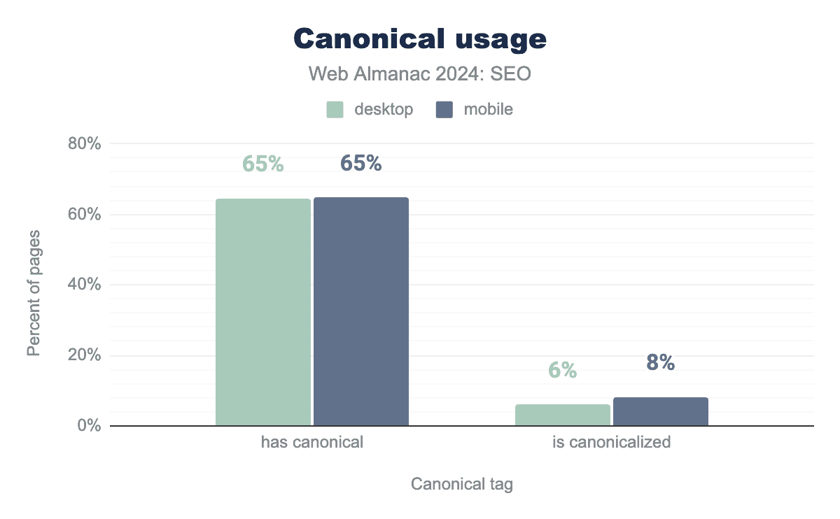 canonical が設定されているか正規化されているページの割合を強調する縦棒グラフ。canonical の採用率は、デスクトップで65%、モバイルで65%、正規化されているのはデスクトップで6%、モバイルで8%。Canonicalの実装