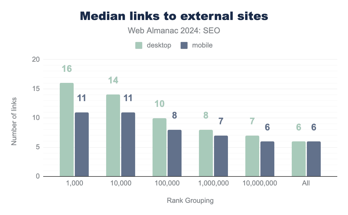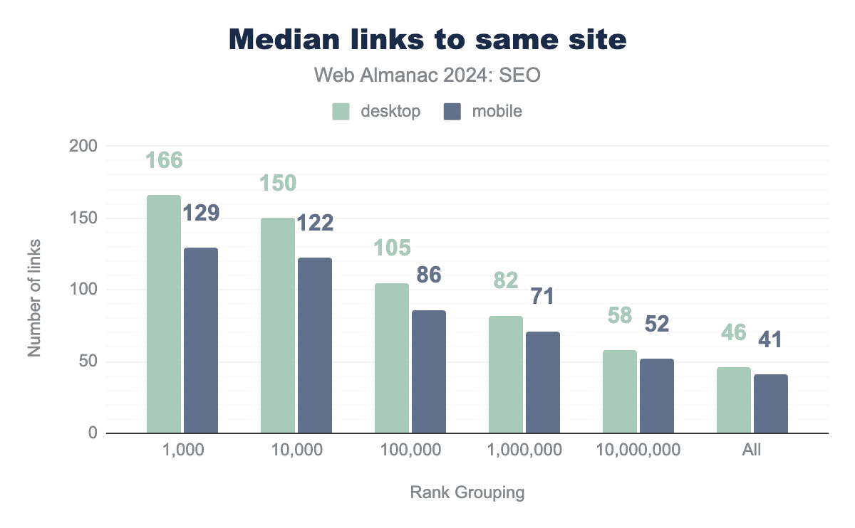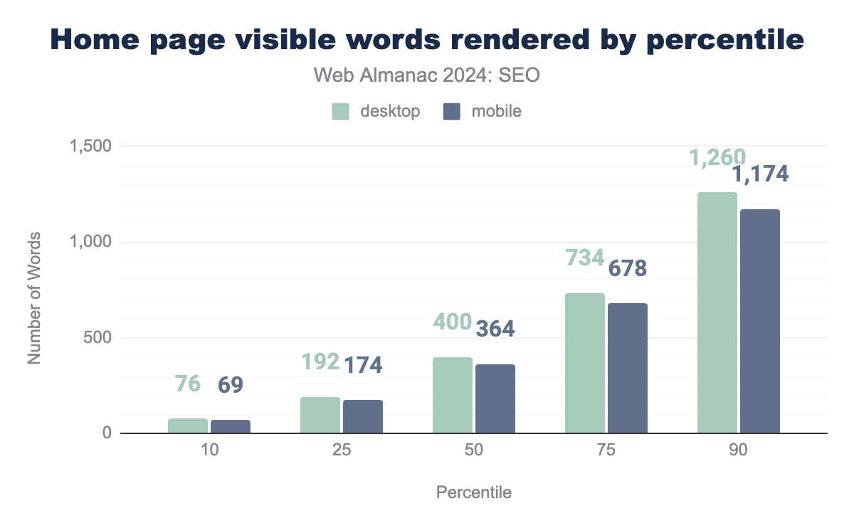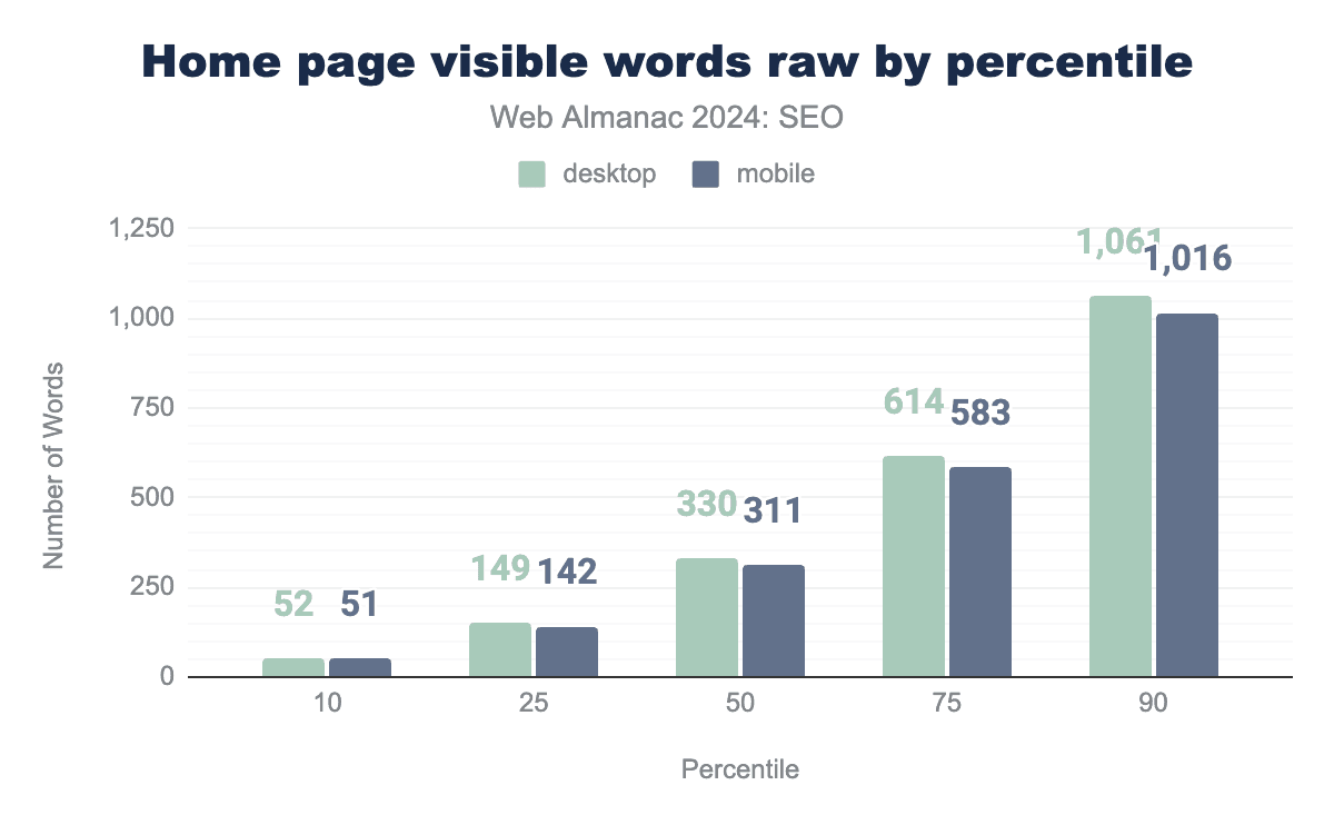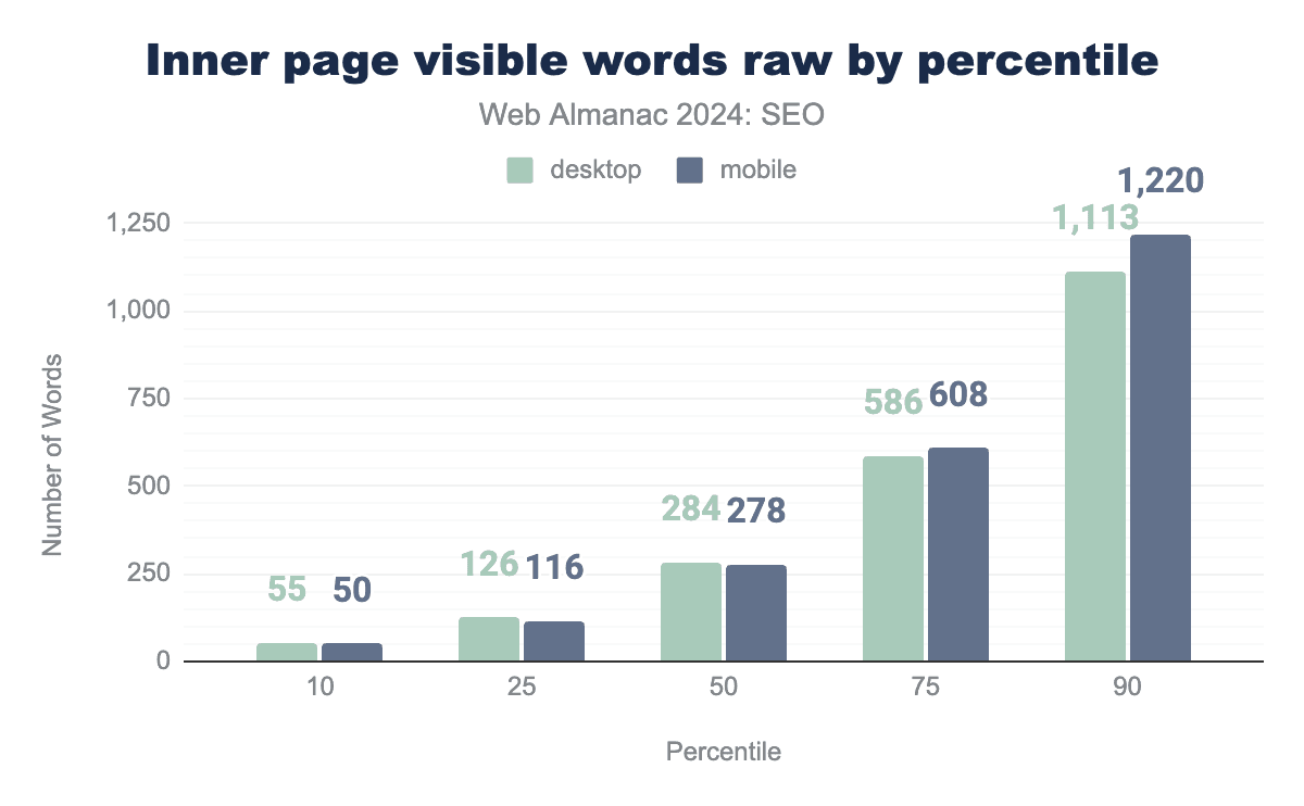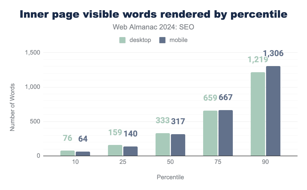 内部ページは全体的にやや少ない単語数を含んでいます。2024年のモバイル内部ページの中央値は、レンダリング後に317の表示可能単語を持ち、デスクトップ内部ページは333語でした。
