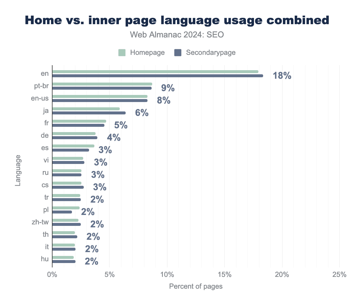 分布に関しては、内部ページでの hreflang タグの使用は、ホームページで見つかったものと類似しています。x-defaultとenは両方のカテゴリーで採用をリードしており、そのグローバルな到達範囲を強調しています。これらの割合は内部ページで低くなっており、hreflang 実装は一般的にホームページで優先されることを示唆しています。