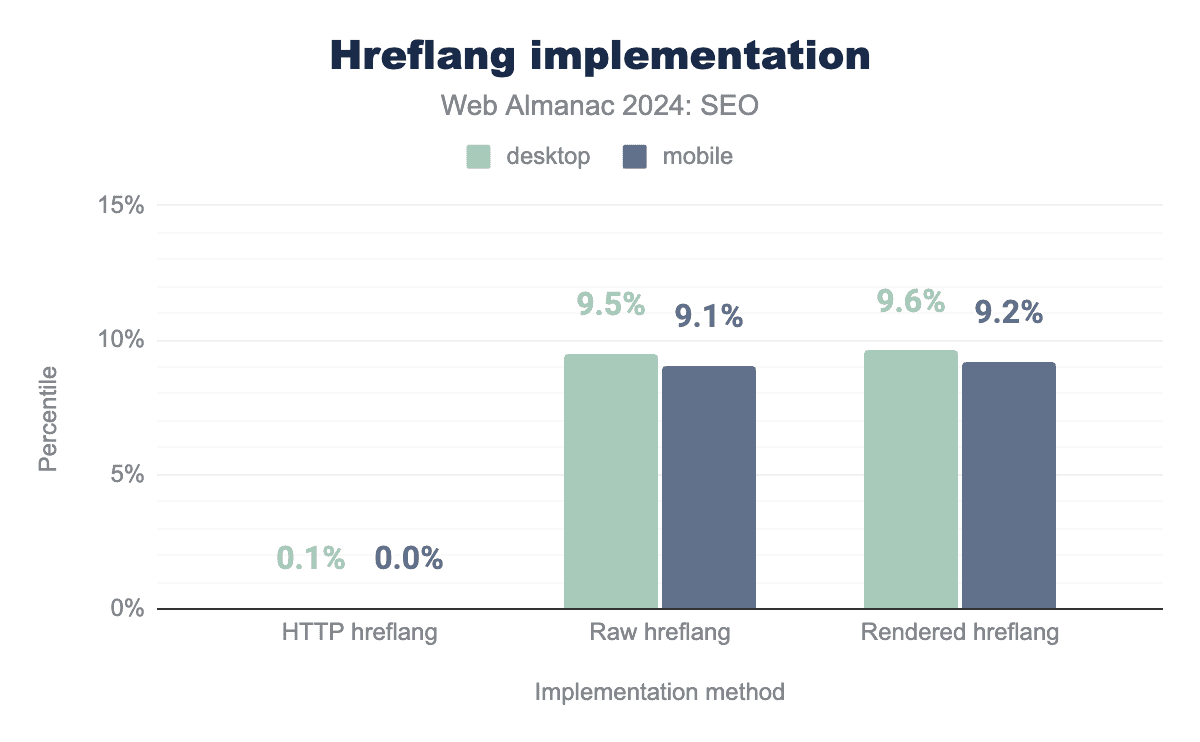hreflang 実装を比較した棒グラフ。HTTP hreflang:0.1%(デスクトップ)と0.1%(モバイル);生 hreflang:9.5%(デスクトップ)と9.1%(モバイル);レンダリング hreflang:9.6%(デスクトップ)と9.2%(モバイル)を示していますhreflang 実装。
