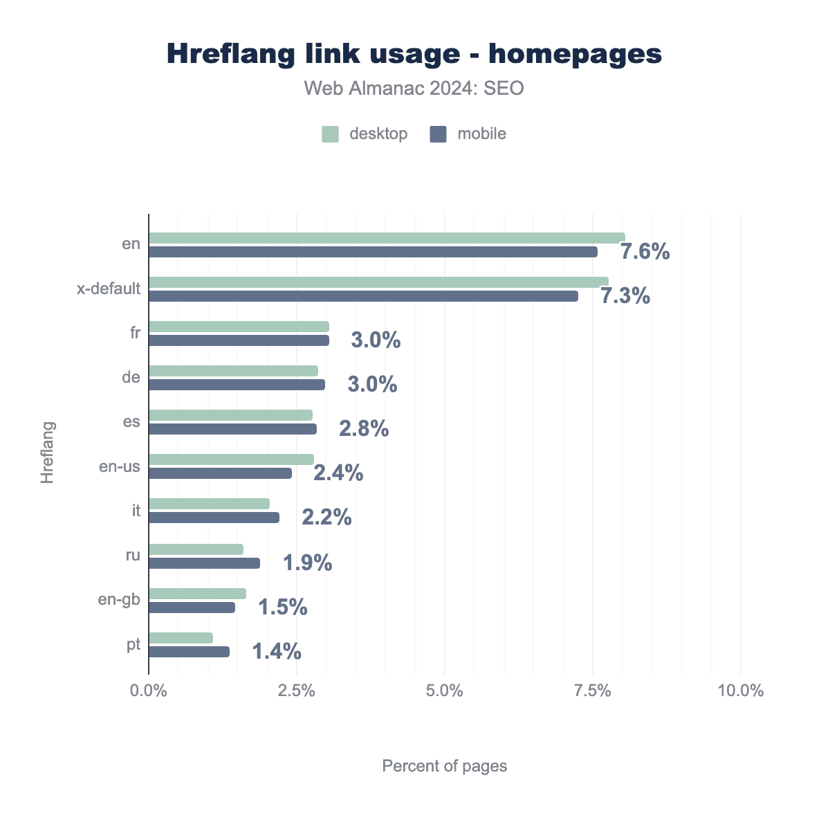 hreflang リンクの使用を言語コードとプラットフォーム(デスクトップ対モバイル)で分類して示す水平棒グラフ。各タグの合計値は、x-default(7.3%)、en(7.1%)、fr(3.0%)、de(3.0%)、es(2.8%)、en-us(2.4%)、it(2.2%)、ru(1.9%)、en-gb(1.4%)、pt(1.3%)です。hreflang リンク使用