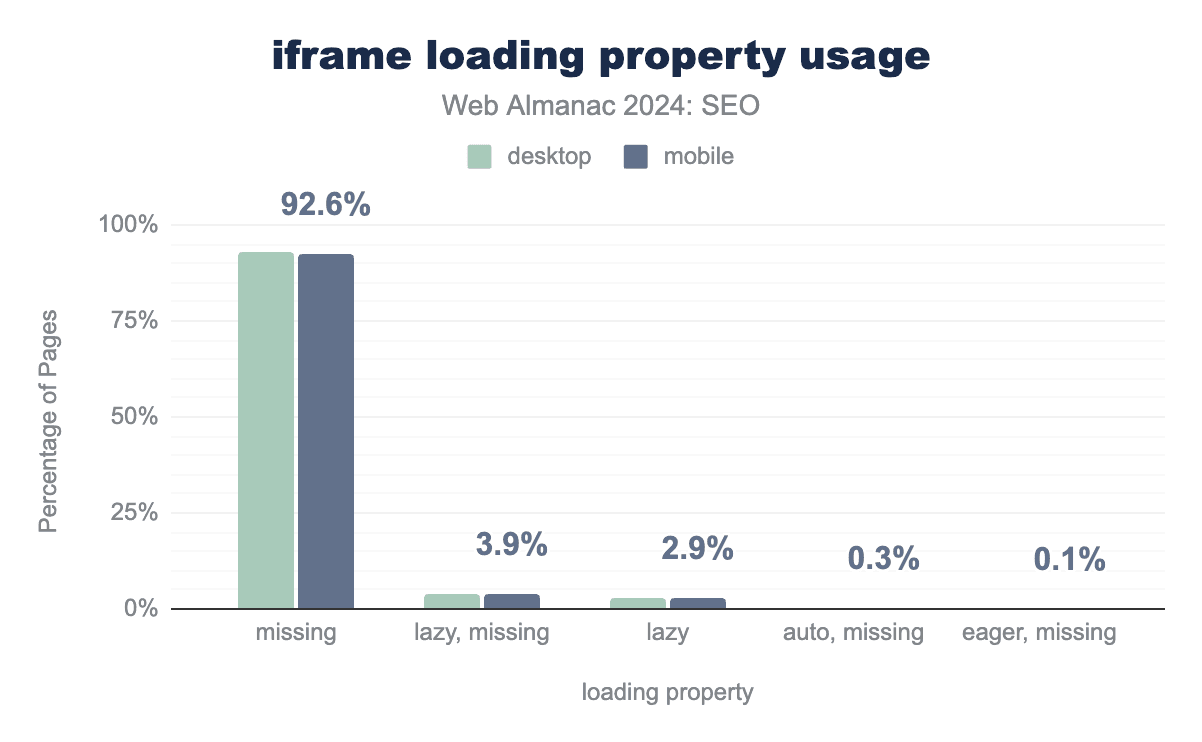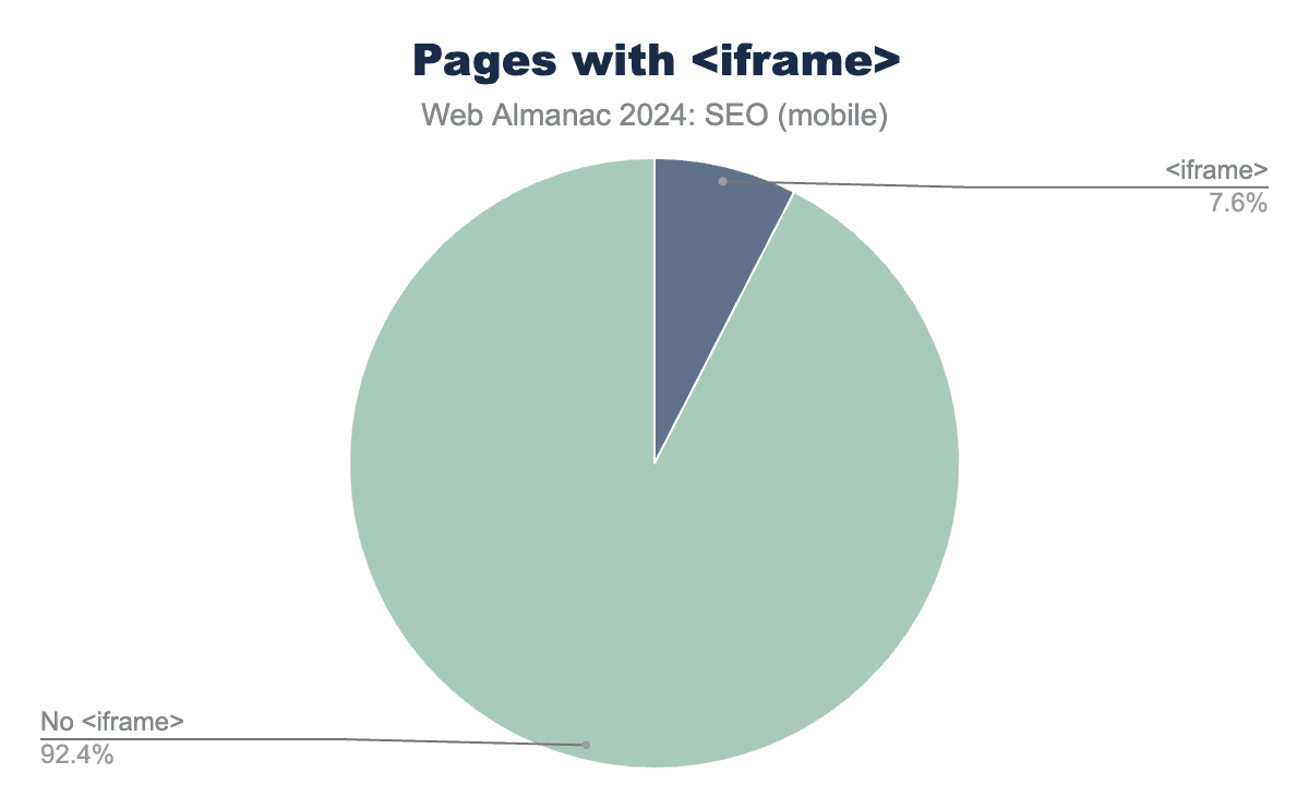 <iframe> の存在は、indexifembedded robotsディレクティブが適用される可能性がある場合のベースラインを提供します。2024年では、モバイルページの7.6%が <iframe> 要素を含んでいました。これは2022年の4.1%から85%の注目すべき増加です。