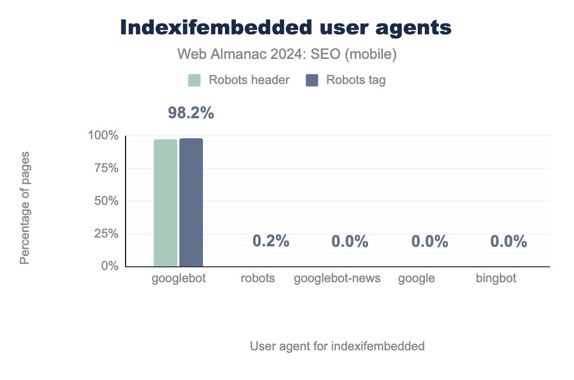 Googlebot ユーザーエージェントをターゲットにしていることを示す棒グラフ。汎用robotsユーザーエージェントは0.2%でした。その他のユーザーエージェント(Googlebot-News と Bingbot を含む)は0%の使用率を示しています。2022年に見たように、indexifembedded ディレクティブは引き続き Googlebot にほぼ独占的に使用されています。robotsヘッダーの使用は2022年の98.3%から2024年の97.2%にわずかに減少しましたが、robotsタグの採用は2022年の66.3%から2024年の98.2%に大幅に増加しました。