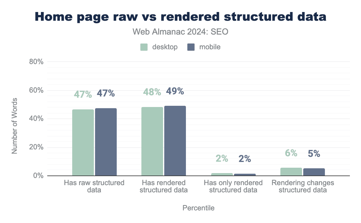 サイトの大部分は生のHTMLで構造化データを提供しており、ホームページのモバイルとデスクトップクロールのわずか2%のみがJavaScript経由で追加された構造化データを持っています。