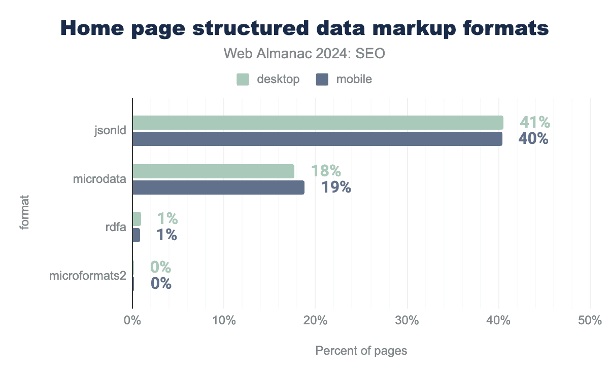 ページに構造化データを実装する方法は数多くありますが、JSON-LDはホームページで圧倒的にもっとも人気のフォーマットです。クロールされたモバイルの40%、デスクトップホームページの41%を占めています。