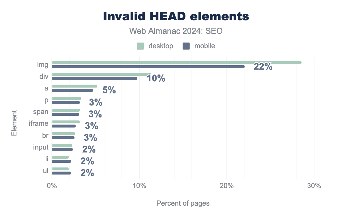 <head> 内で無効なさまざまなHTML要素を持つページの割合を示す縦棒グラフ。デスクトップでは、<img> がページの29%でheadに使用され、<div> が11%、<a> が5%、<p> が3%、<span> が3%、<iframe> が3%、<br> が3%、<input> が2%、<li> が2%、最後に <ul> が2%。モバイルも非常に似ており、それぞれ22%、10%、5%、3%、3%、3%、3%、2%、2%、2%。<head> 要素