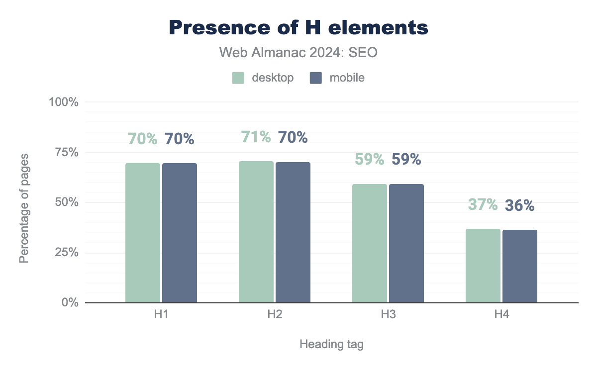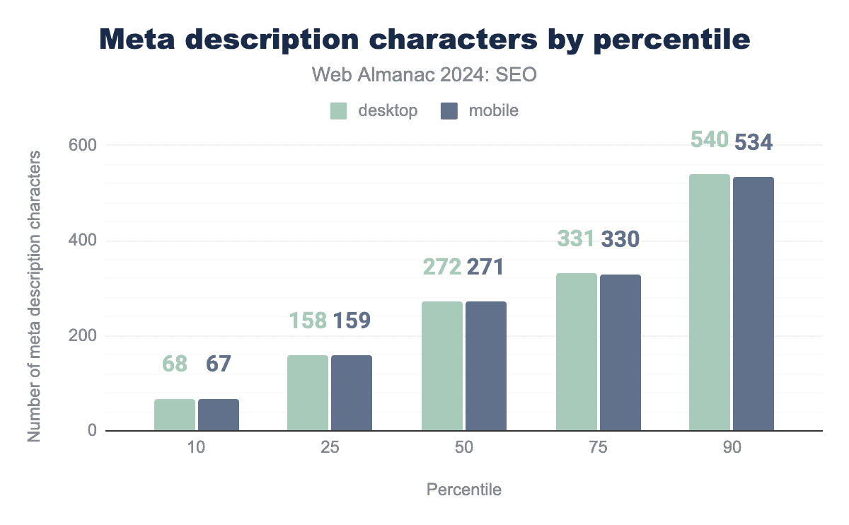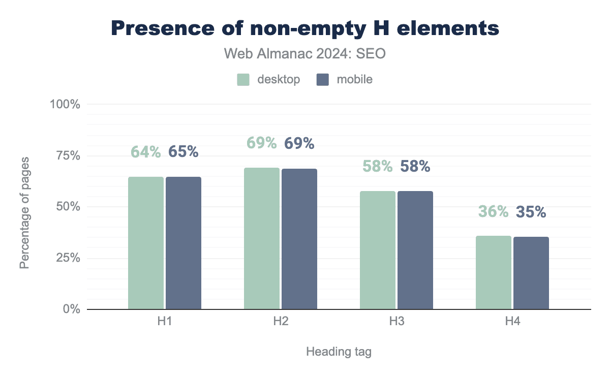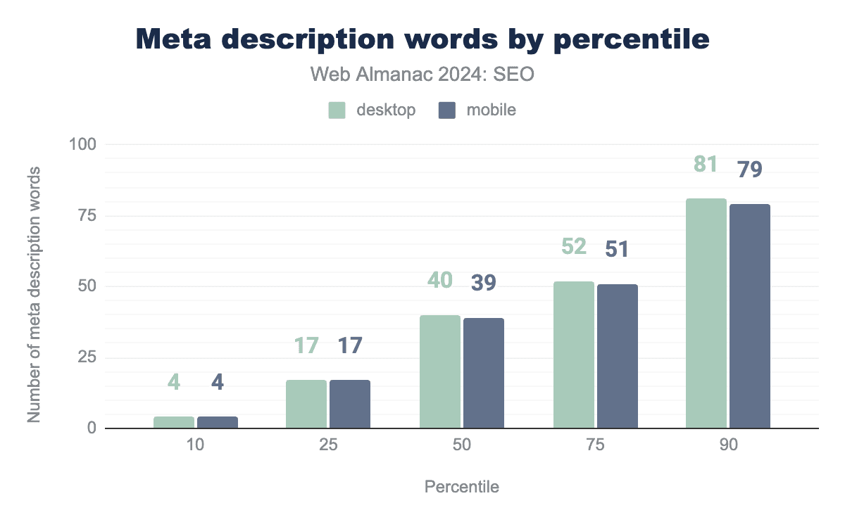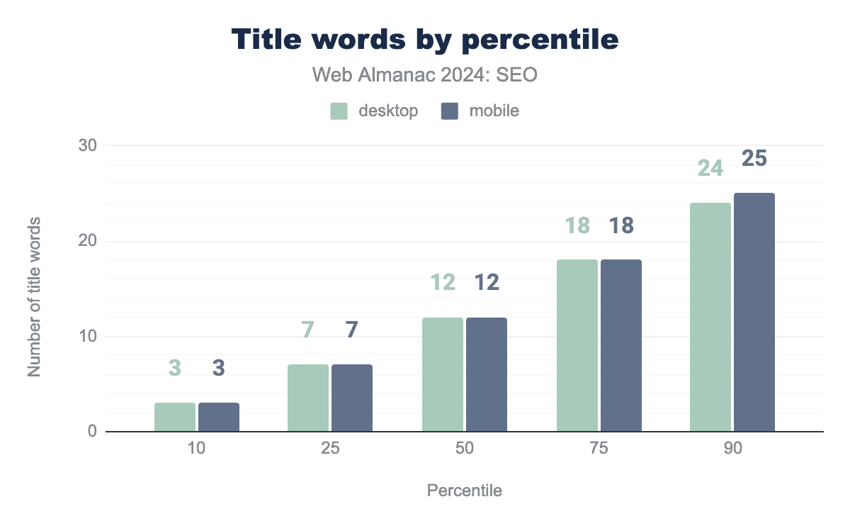 注目すべきは、モバイルとデスクトップのホームページ単語数の差が、2024年にはわずか36語まで縮まったことです。これは2022年の55語と比較したものです。これは、モバイルユーザーに提供されるコンテンツとの間にわずかながらより近いパリティを示唆しています。Googleは、主にモバイルユーザーエージェントでページをクロールしてインデックス化するモバイルファーストインデックス戦略への移行プロセスを完了しています。これが残りのいくつかのサイトにモバイル訪問者に完全なコンテンツを提供するよう促進したと結論づけるのが妥当です。