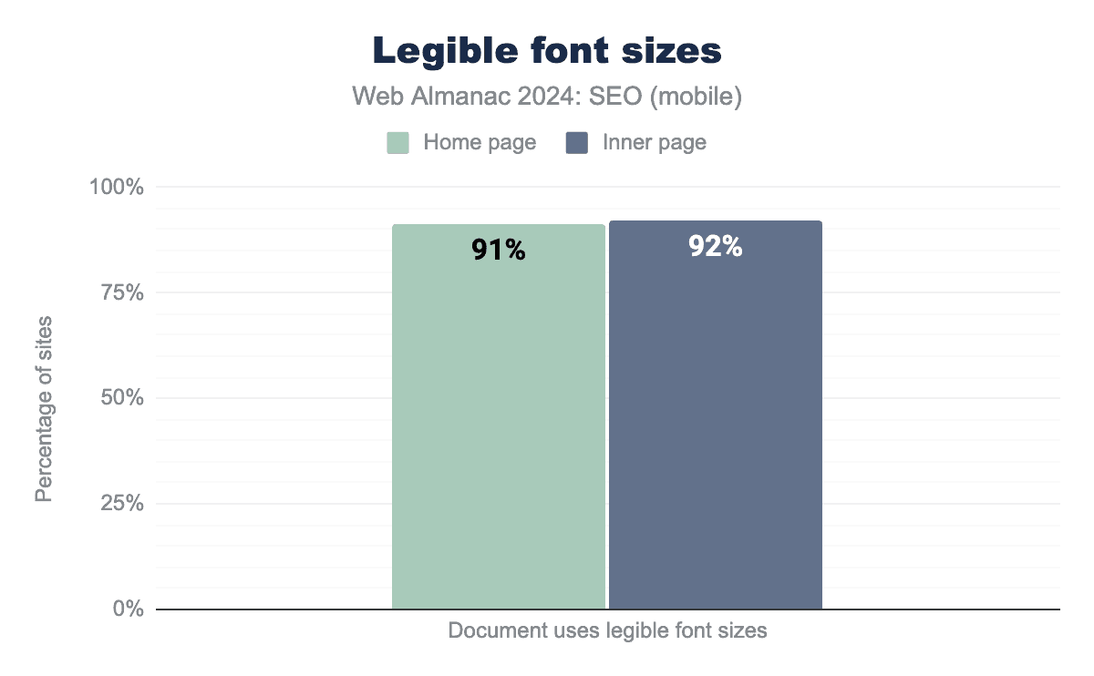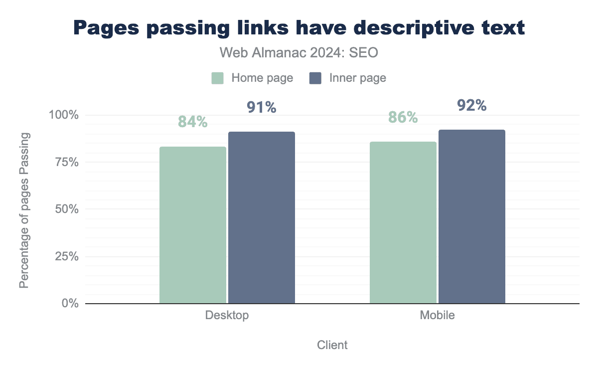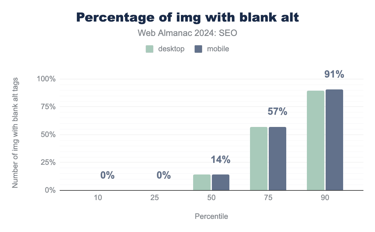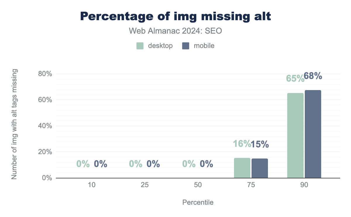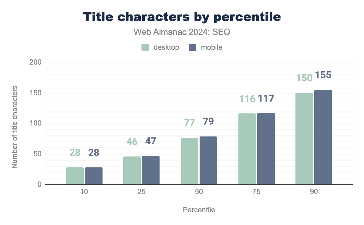 注目すべきは、モバイルとデスクトップのホームページ単語数の差が、2024年にはわずか36語まで縮まったことです。これは2022年の55語と比較したものです。これは、モバイルユーザーに提供されるコンテンツとの間にわずかながらより近いパリティを示唆しています。Googleは、主にモバイルユーザーエージェントでページをクロールしてインデックス化するモバイルファーストインデックス戦略への移行プロセスを完了しています。これが残りのいくつかのサイトにモバイル訪問者に完全なコンテンツを提供するよう促進したと結論づけるのが妥当です。