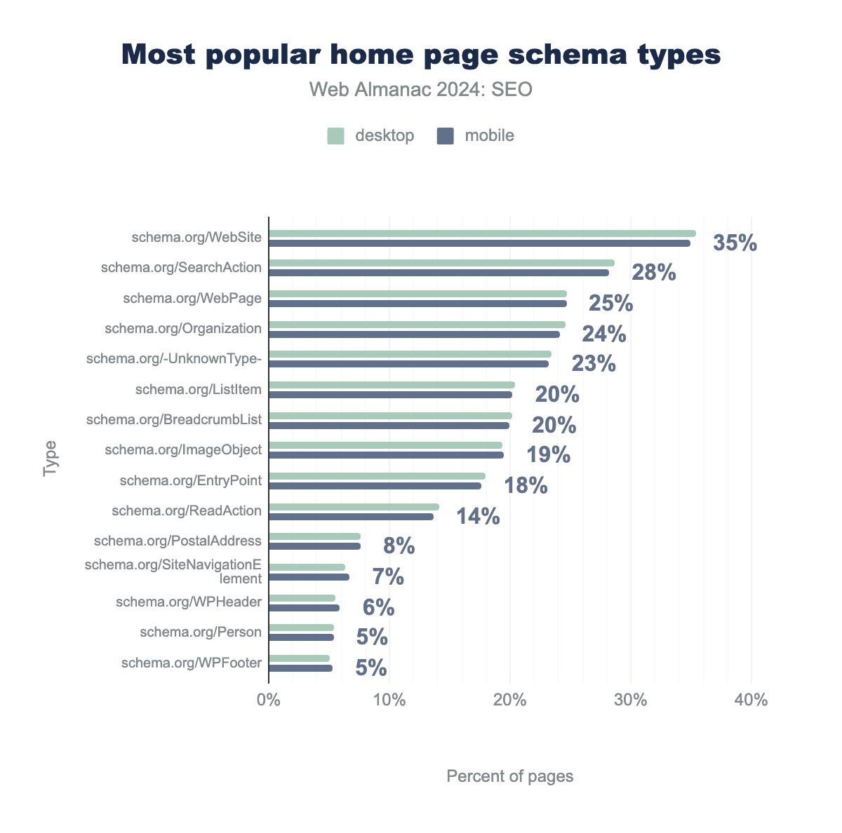 schema.org/WebSite が35%、schema.org/SearchAction が29%、schema.org/WebPage が25%、schema.org/Organization が25%、schema.org/-UnknownType- が24%、schema.org/ListItem が20%、schema.org/BreadcrumbList が20%、schema.org/ImageObject が19%、schema.org/EntryPoint が18%、schema.org/ReadAction が14%、schema.org/PostalAddress が8%、schema.org/SiteNavigationElement が6%、schema.org/WPHeader が6%、schema.org/Person が5%、schema.org/WPFooter が5%で見つかりました。モバイルでは、それぞれ35%、28%、25%、24%、23%、20%、20%、20%、18%、14%、8%、7%、6%、5%、5%のページで見つかりました。2022年と比較して、ホームページで見つかった構造化データタイプの人気に関して、2024年に大きな変化はありませんでした。WebSite、SearchAction、WebPage は、GoogleのSitelinks Search Boxを支えるため、引き続き3つのもっとも人気のあるスキーマタイプでした。