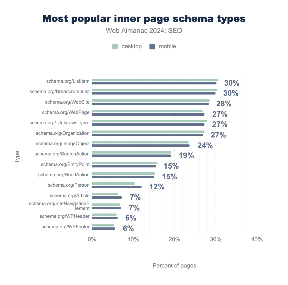 schema.org/ListItem が31%、schema.org/BreadcrumbList が30%、schema.org/WebSite が29%、schema.org/WebPage が27%、schema.org/-UnknownType- が28%、schema.org/Organization が27%、schema.org/ImageObject が24%、schema.org/SearchAction が19%、schema.org/EntryPoint が16%、schema.org/ReadAction が15%、schema.org/Person が10%、schema.org/Article が6%、schema.org/SiteNavigationElement が7%、schema.org/WPHeader が6%、schema.org/WPFooter が5%で見つかりました。モバイルでは、それぞれ30%、30%、28%、27%、27%、27%、24%、19%、16%、15%、12%、7%、7%、6%、6%のページで見つかりました。内部ページに関して、ListItem は2024年にもっとも人気のスキーマタイプで、モバイルの30%、デスクトップURLの31%を占めました。商品、イベント、記事ページなどの「リーフ」ページよりも、リスティングページの方が多いというのは理にかなっています(ただし、Article スキーマは12番目にもっとも人気のあるタイプでした)。