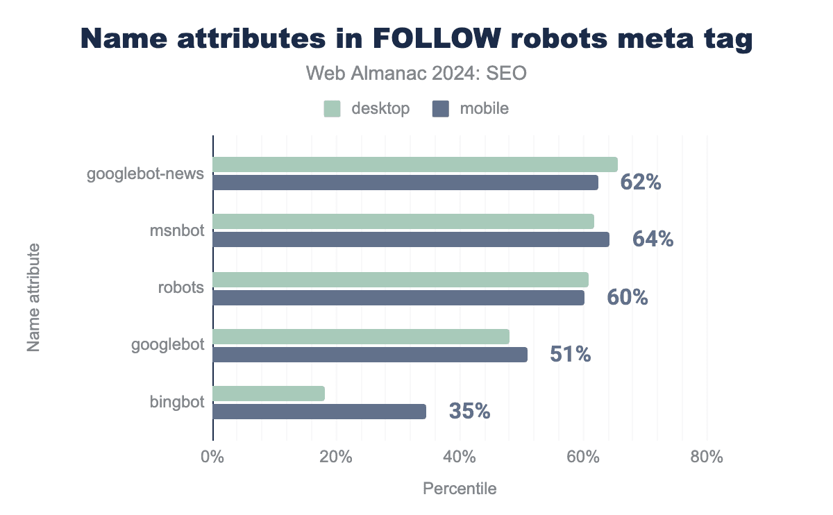 Googlebot-News という名前の属性が62%、MSNBot が64%、robots が60%、Googlebot が51%、Bingbot が35%の該当ページで使用。デスクトップも同様で、それぞれ66%、62%、61%、48%、18%。follow robotsメタタグのname属性