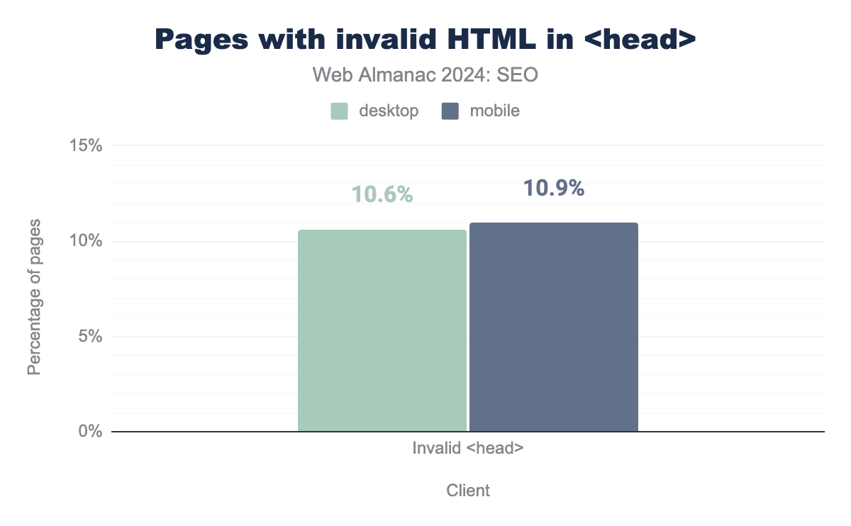 2024年では、モバイルページの10.9%が <head> を破壊する無効なHTML要素を持っていました。これは2022年の12.6%から12%の減少を示しています。一方、<head> 内に無効なHTMLを持つデスクトップページは、2022年の12.7%から2024年の10.6%に減少しました。
