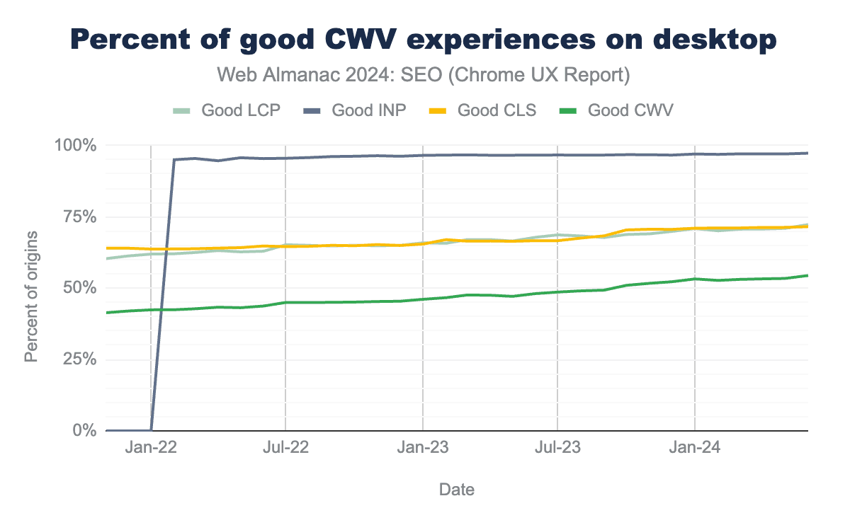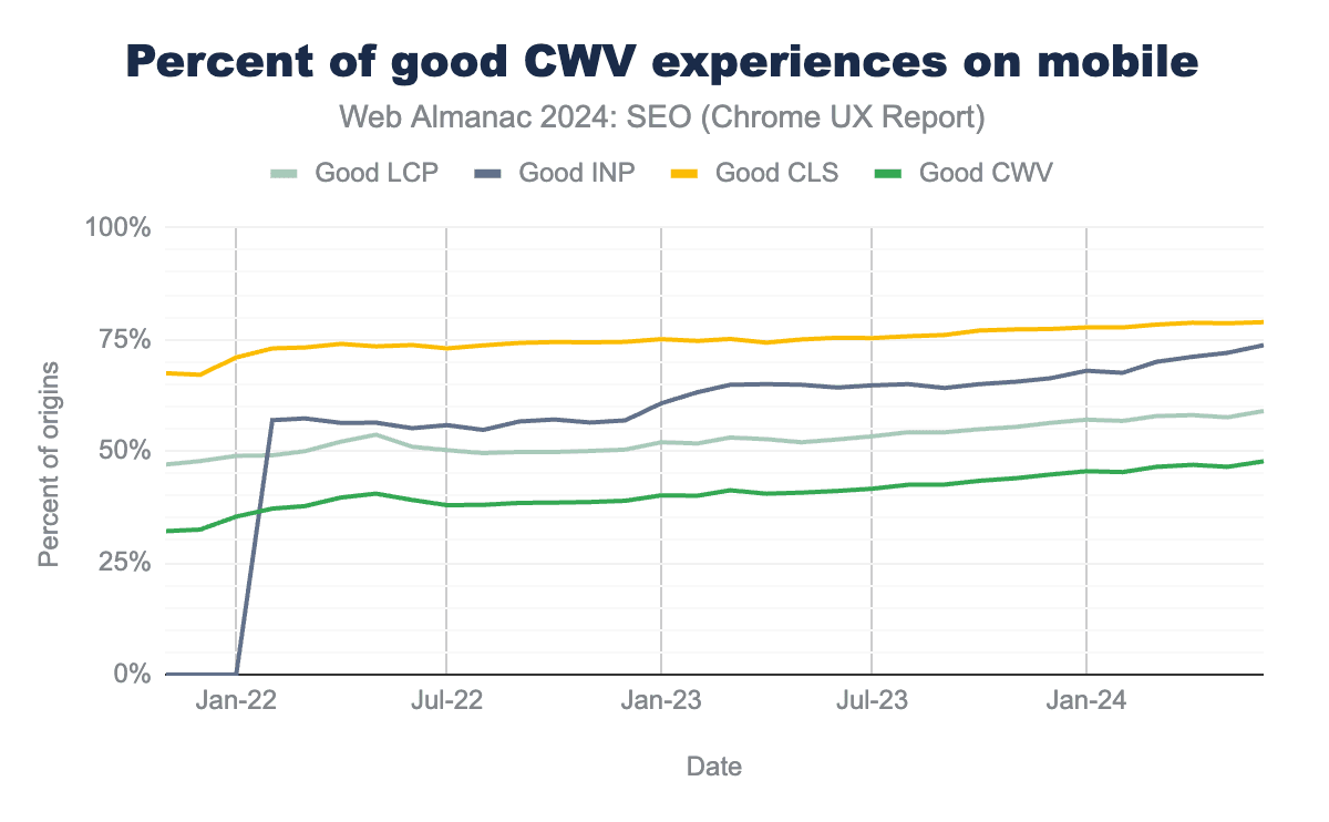 とはいえ、いつものビジネスというわけではありませんでした。First Input Delay(FID)という議論の余地があるが合格しやすい指標をInteraction to Next Paint(INP)が置き換えたにもかかわらず、Core Web Vitals(CWV)を通過するサイトの数は驚異的でした。そのポジティブなニュースは、一般的にパフォーマンスがSEO業界でより真剣に受け止められていることを示しています。