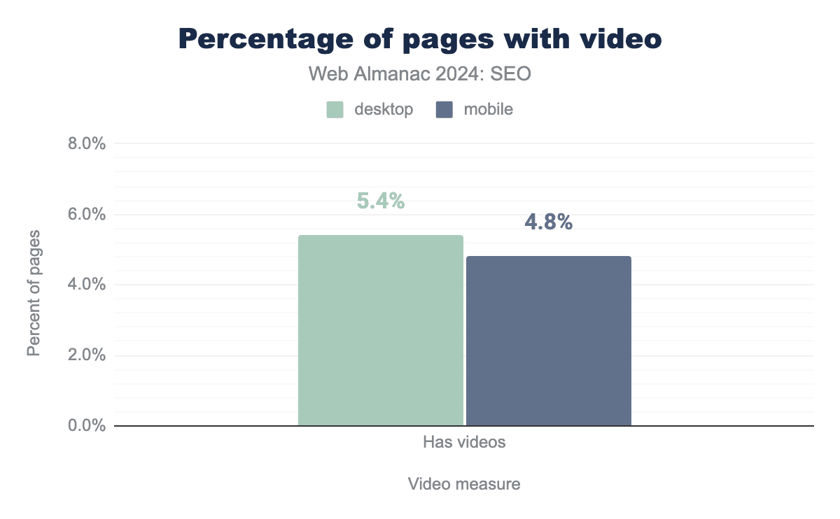 構造化データの全体的な使用量は、2024年にモバイルホームページの49%、デスクトップホームページの48%まで増加しました。これは、クロールされたモバイルホームページの47%、デスクトップホームページの46%が構造化データを持っていた2022年からのわずかな増加でした。