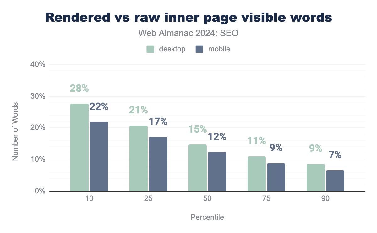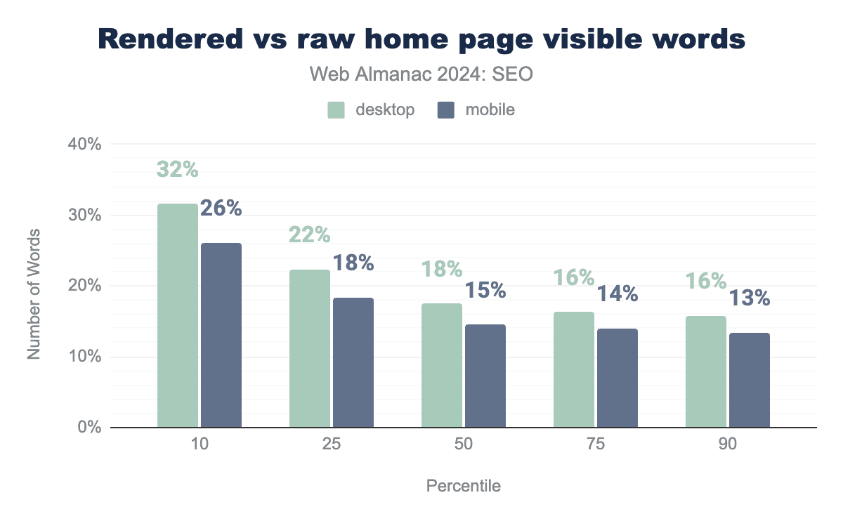 ホームページでレンダリング表示可能単語数と生単語数を比較すると、驚くほど小さな差異があり、中央値でモバイルが13.6%、デスクトップが17.5%の差を示しています。
