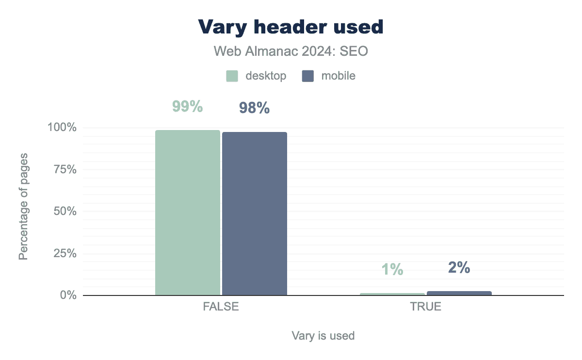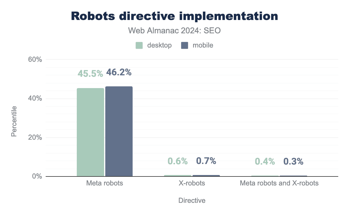どちらの実装方法も有効で、併用できます。メタタグ実装がもっとも広く採用されており、デスクトップページの45.5%、モバイルページの46.2%を占めています。X-robots HTTPヘッダーは1%未満のページに適用されています。少数のサイトが両方のタグを併用していました。これらはデスクトップページの0.4%、モバイルページの0.3%を占めていました。