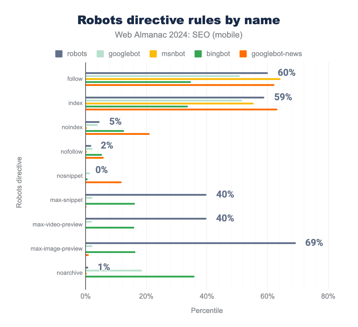 follow: 64%, 62%, , 60%, 51%, 35%。index: 55%, 63%, 59%, 52% 34%。noindex: 1%, 21%, 5%, 4%, 13%。nofollow: 1%, 6%, 2%, 2%, 5%。nosnippet: 0%, 12%, 0%, 1%, 1%。max-snippet: 0%, 0%, 40%, 2%, 16%。max-video-preview: 0%, 0%, 40%, 2%, 16%。max-image-preview: 0%, 1%, 69%, 2%, 17%。noarchive: 0%, 0%, 1%, 19%, 36%。robotsディレクティブルールをname属性で見ると、さまざまな適用率が見られます。これは、SEO担当者が個々の検索エンジンのインデックス化と配信を管理するために、特定のボット名によるディレクティブを採用していることを示しています。